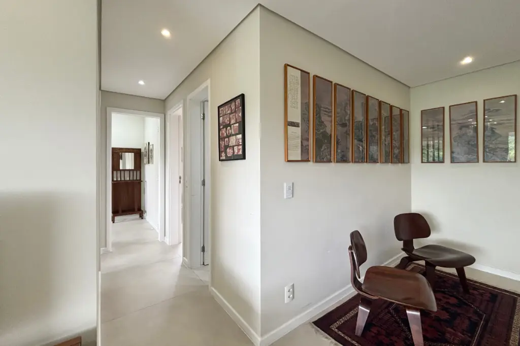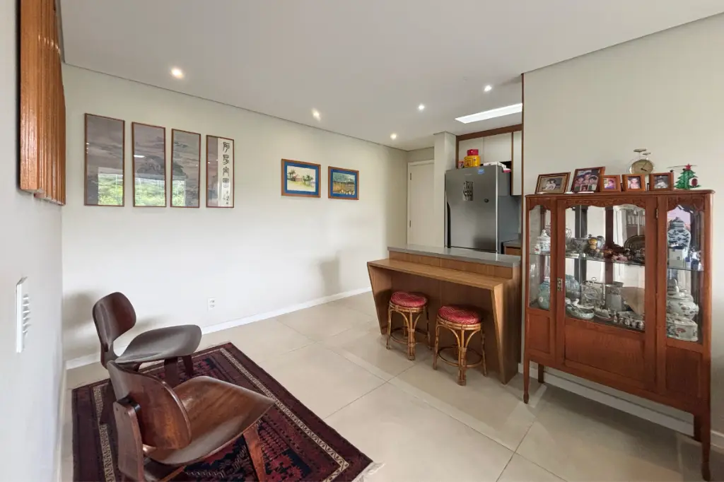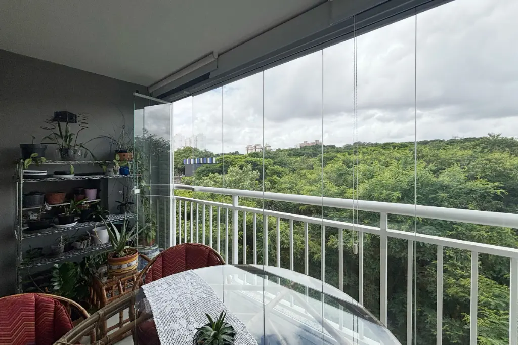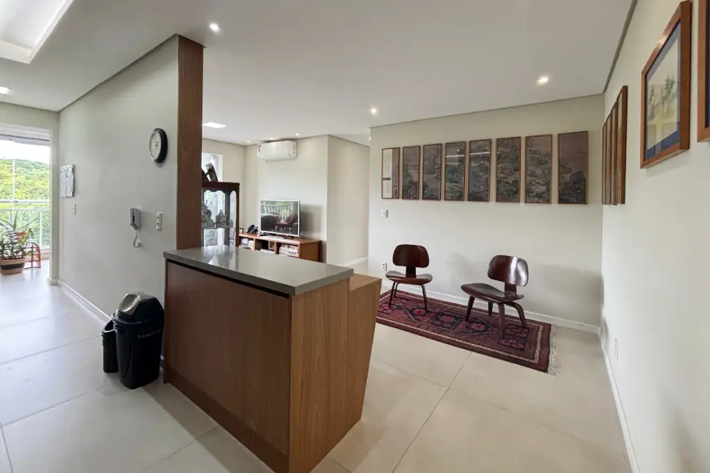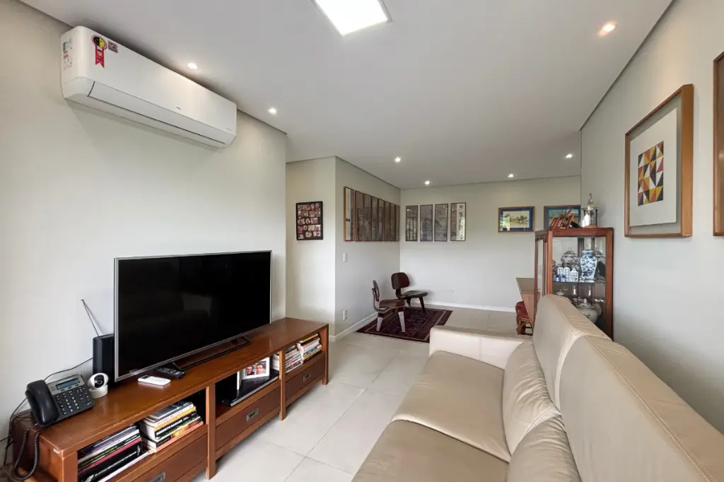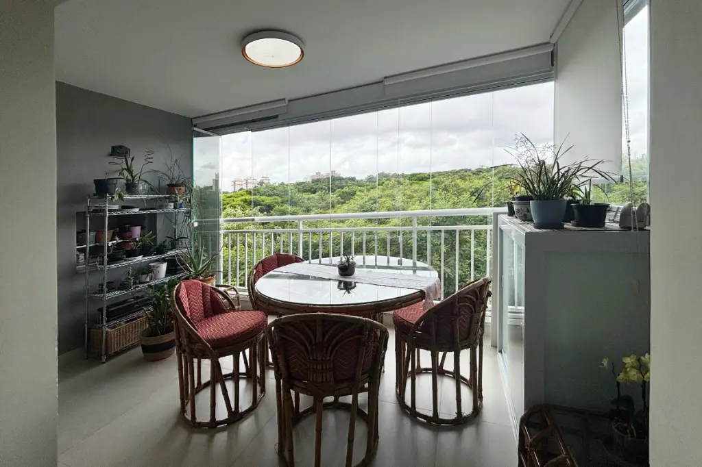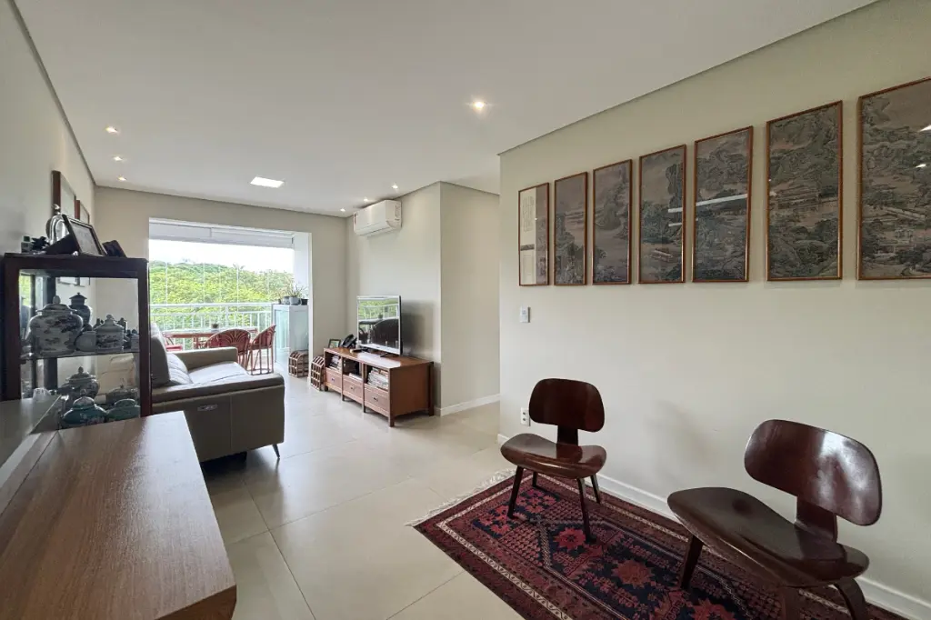 A sala é espaçosa, comporta dois ambientes, possui ar-condicionado e se integra à varanda gourmet com vista permanente para o bosque, um ambiente perfeito para relaxar ou receber amigos com conforto e tranquilidade.