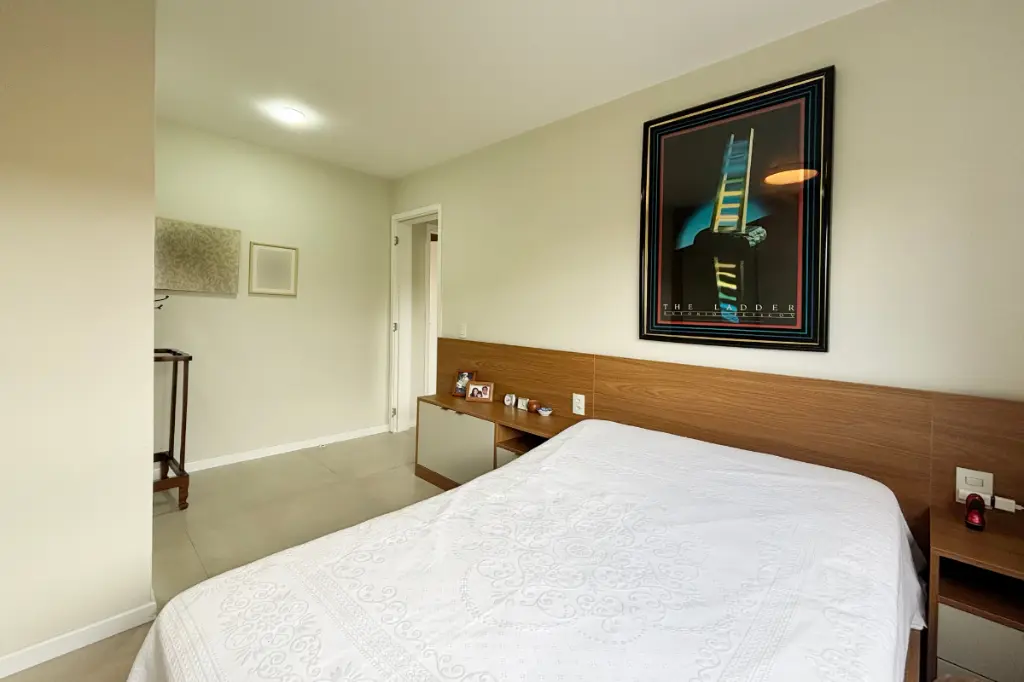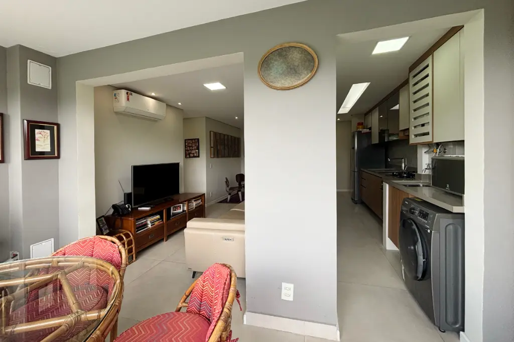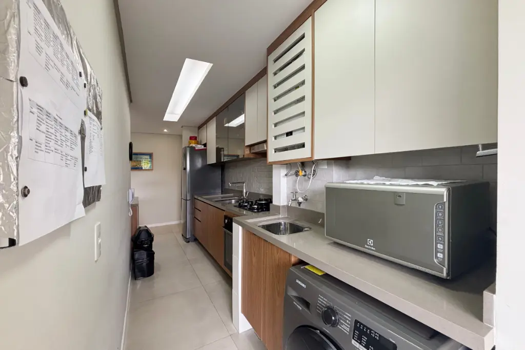 A cozinha é prática e funcional, integrada à área de serviço, otimizando o espaço e facilitando o dia a dia. O apartamento conta com banheiro social e 2 vagas de garagem cobertas.