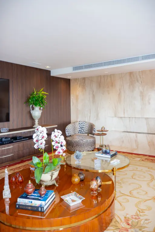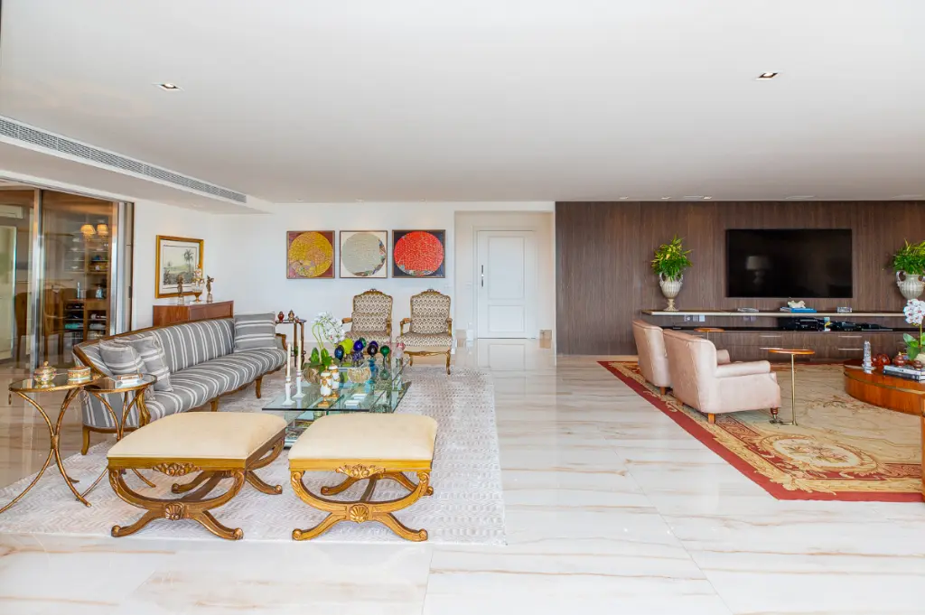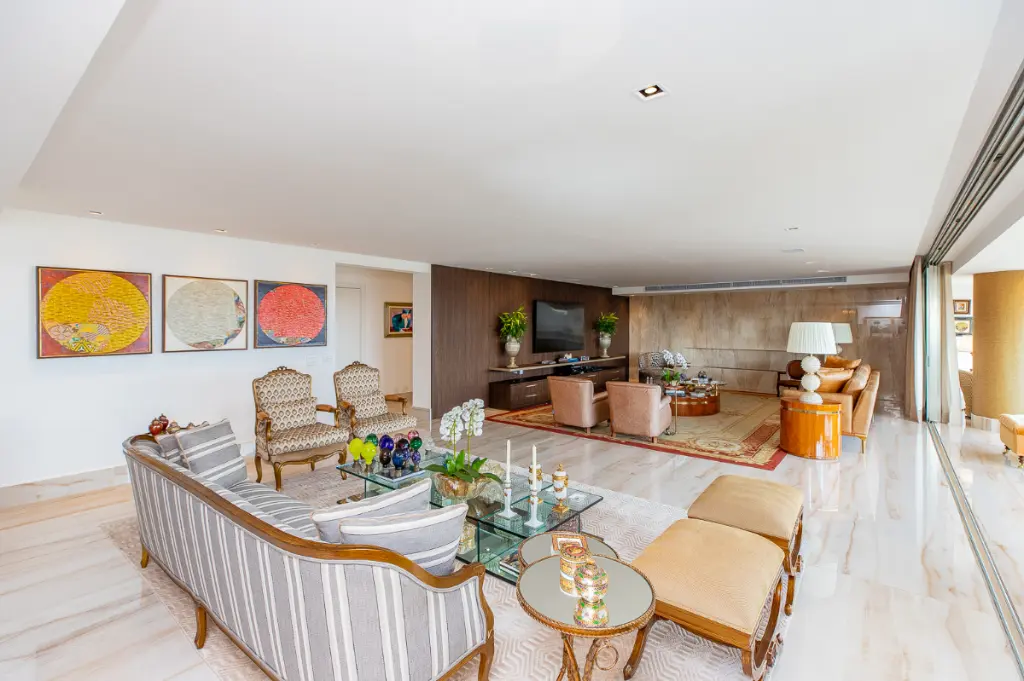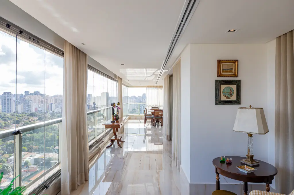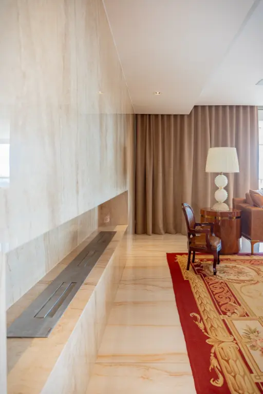 O hall de entrada é privado e conta com dois elevadores sociais. Logo na entrada encontramos o lavabo, duas generosas salas de estar com projetor e lareira. A varanda abraça todo o apartamento e já esta com fechamento de vidro mas as portas entre as salas e a varanda permanecem caso o novo morador queira mais privacidade.