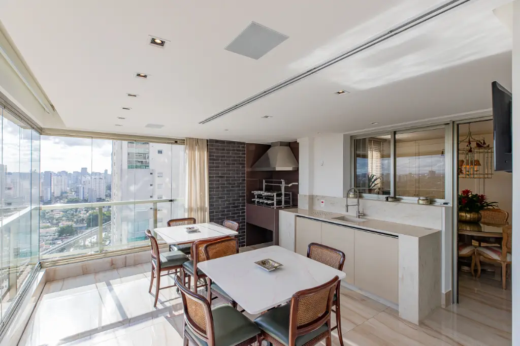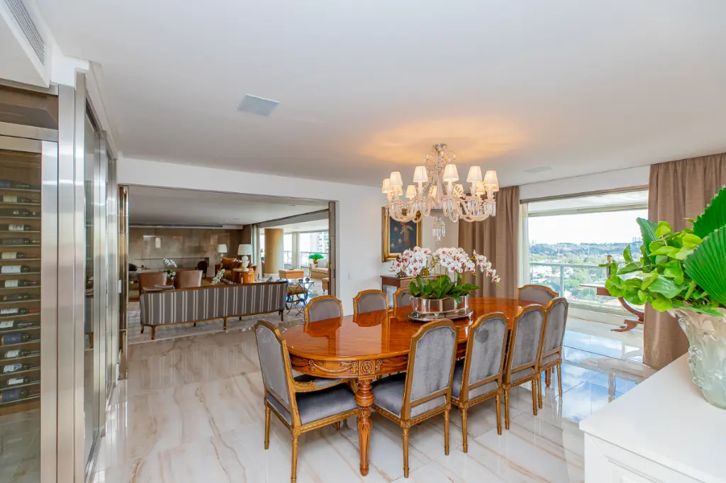 A sala de jantar divide a atenção com uma adega climatizada para 300 garrafas e armário com louceiro. Atrás dessa adega, ainda tem espaço para uma prataria. Atrás da sala de jantar também tem uma copa para refeições do dia a dia.
