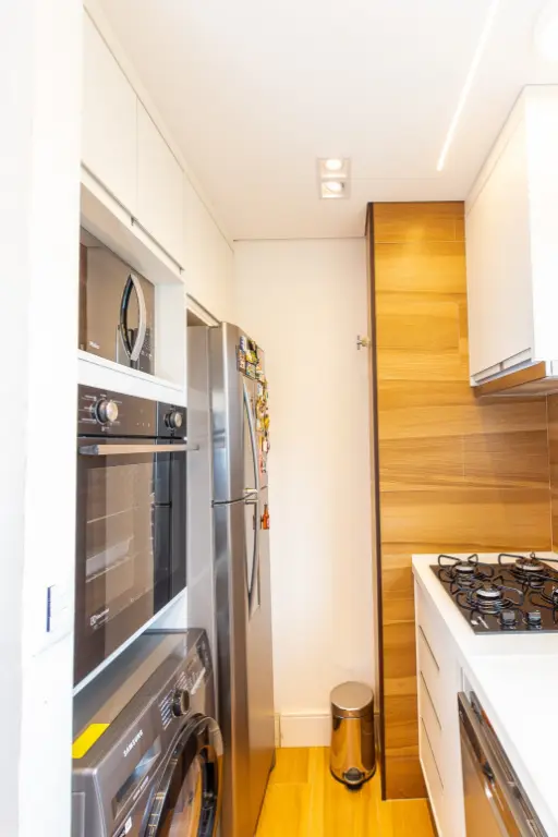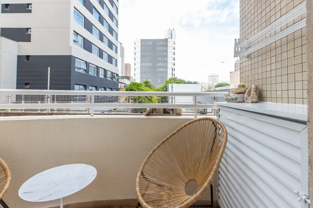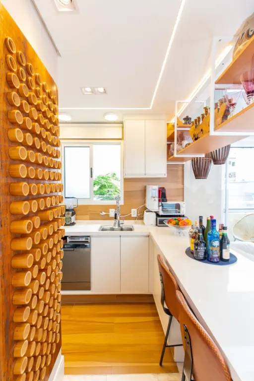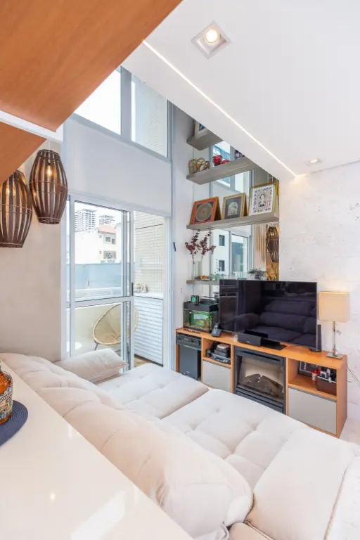 Ao adentrar, você é recebido por um espaço integrado, onde o living harmoniza-se com uma cozinha conceito aberto, equipada com cooktop e repleta de armários planejados. Uma lareira elétrica adiciona um toque acolhedor ao ambiente, enquanto uma varanda convida à contemplação da paisagem urbana.