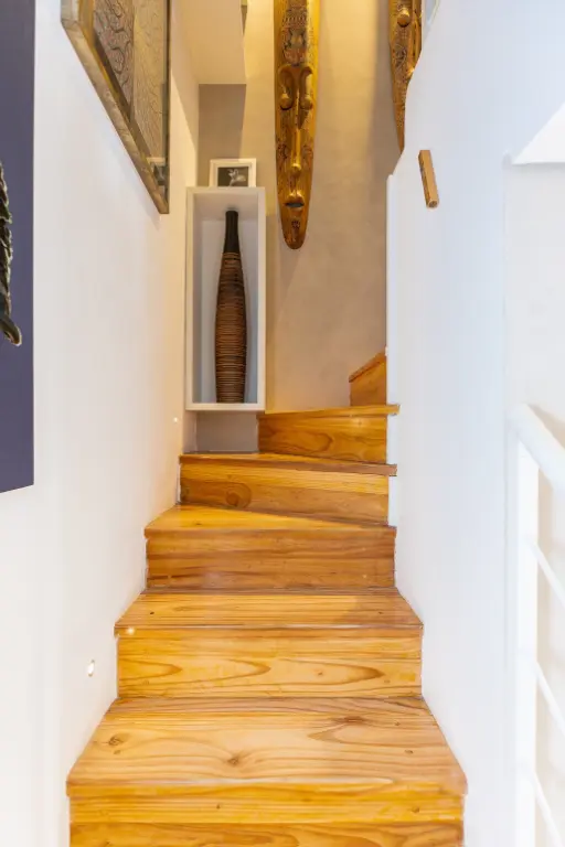Subindo a escada, uma suíte confortável aguarda, proporcionando privacidade e aconchego. O ambiente é complementado por acabamentos de alta qualidade, como o piso de madeira e o sistema de automação residencial, que controla desde a iluminação até o ar condicionado, garantindo conforto e conveniência.
