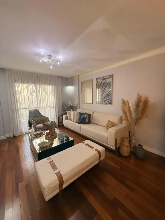 Os ambientes são amplos e bem iluminados, com sala de estar e jantar integradas, criando um espaço acolhedor e perfeito para receber amigos e familiares. A varanda traz um toque especial para momentos de descanso, enquanto o acabamento com piso de madeira e piso frio agrega elegância e praticidade ao dia a dia.