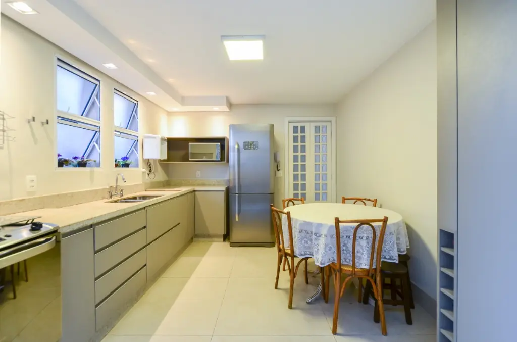 A cozinha é ampla, espaçosa e próxima a ela fica a área de serviço.