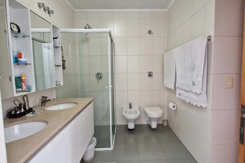 Entre seus diferenciais estão o salão com piscina coberta e aquecida, porão subterrâneo, três reservatórios de água, boiler com aquecimento solar e sistema de reaproveitamento de água de chuva com bomba de irrigação para o jardim. Outros detalhes reforçam a qualidade e o conforto, como sanitários suspensos, ar-condicionado tipo split frio/quente na sala e suítes, além de portões automatizados, sistema de alarme e câmeras com monitoramento à distância.