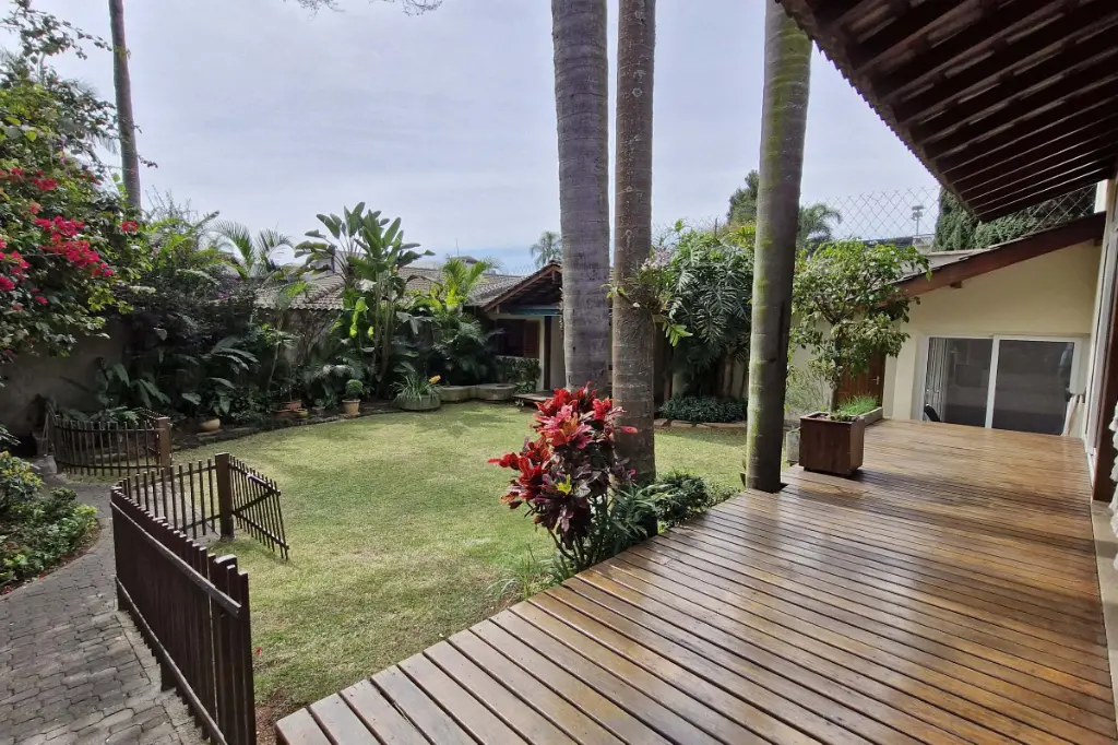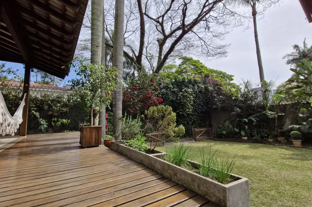 A área externa é um convite ao lazer e ao convívio: quintal com muito verde, espaço gourmet, edícula com quarto, banheiro, churrasqueira e varanda coberta. A propriedade também conta com quarto/oficina, dependência de empregada com banheiro e garagem coberta para dois carros.