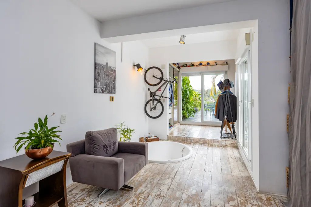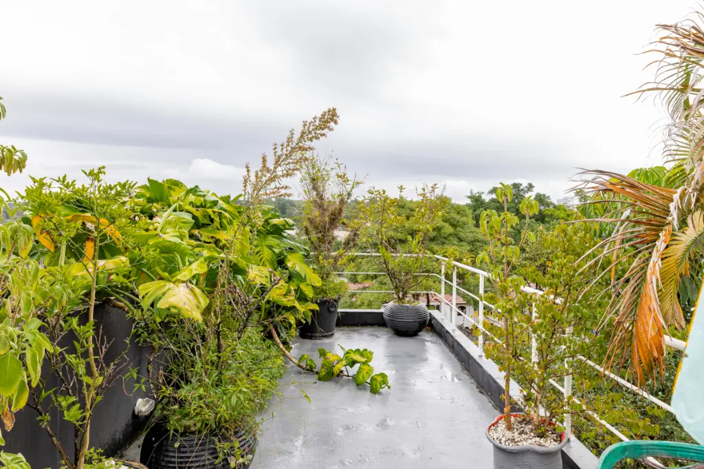 São duas suítes internas, sendo uma delas master, com jacuzzi em local inusitado, e uma deliciosa varanda verde bem grande.