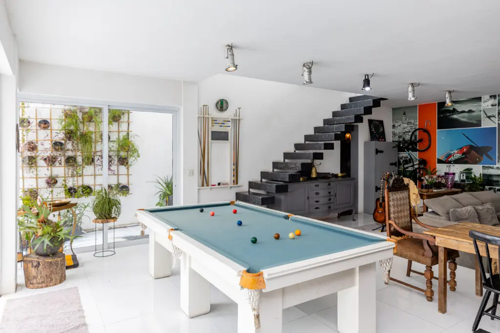 Sala ampla com cozinha moderna e integrada com vista da área da piscina. Embaixo da escada um espaço perfeito para uma adega.