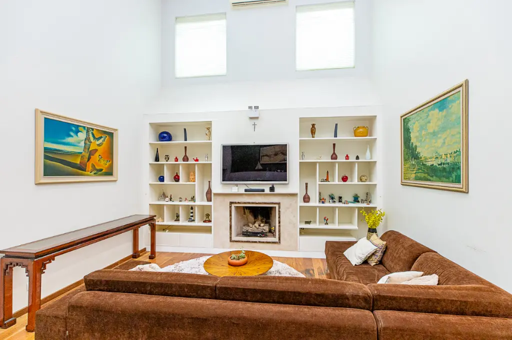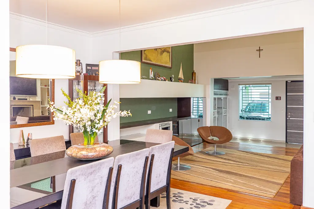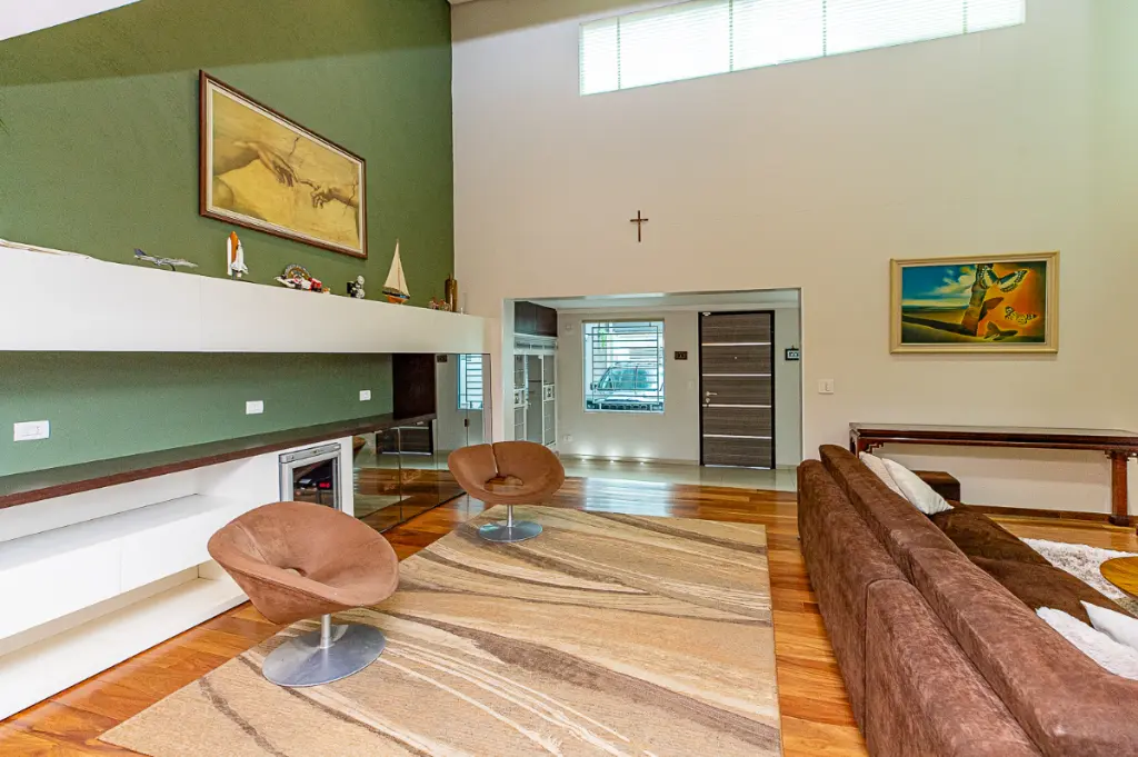 O hall de entrada dá acesso à ampla sala de estar com lareira, e espaço para dois ambientes integrados a sala de jantar, proporcionando um layout agradável para os seus encontros.