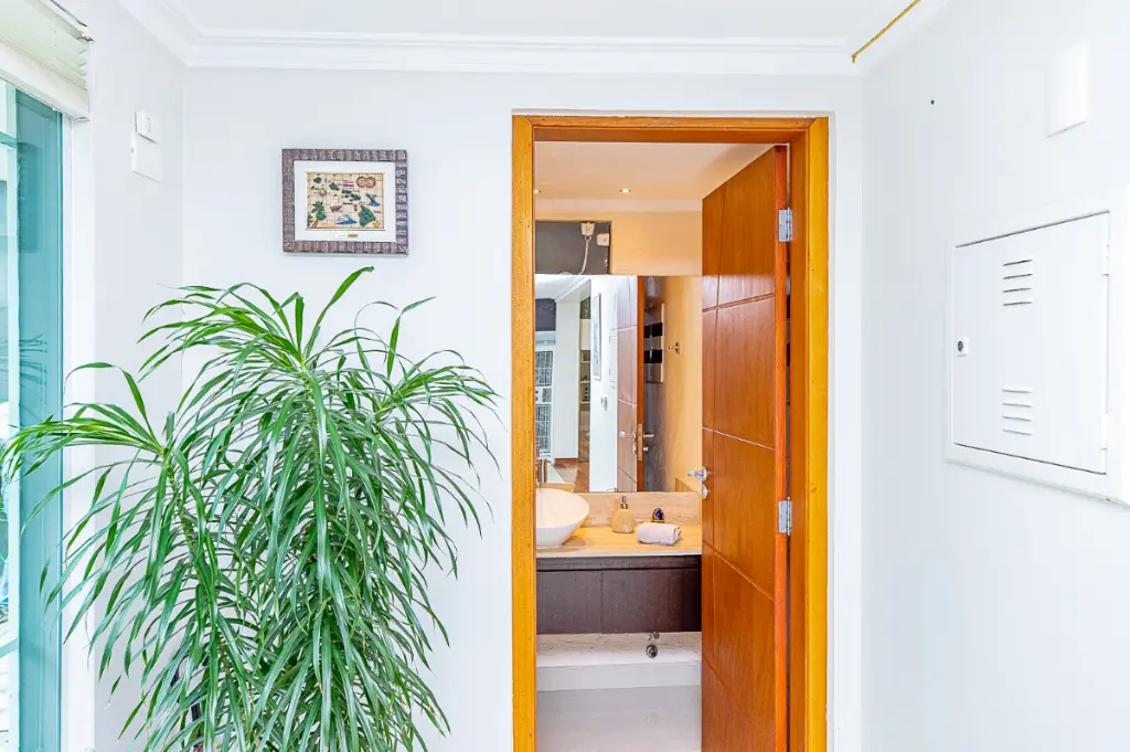 A suíte master com varanda e vista para a piscina, com amplo closet e um espaçoso banheiro com hidromassagem para relaxar. Há também mais um quarto com banheiro, que pode ser facilmente transformado em mais uma suíte