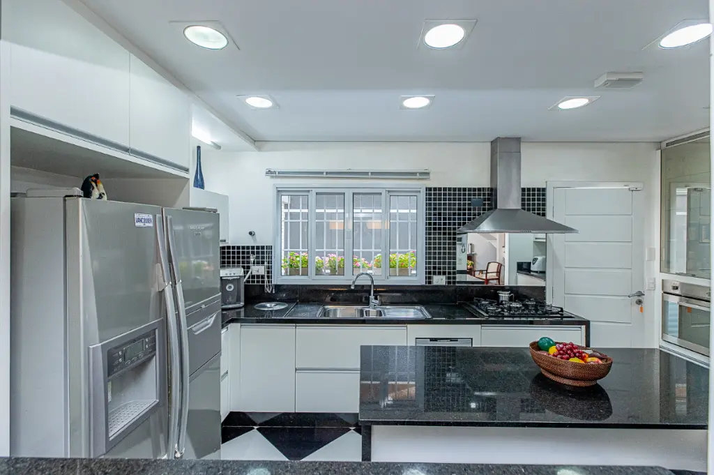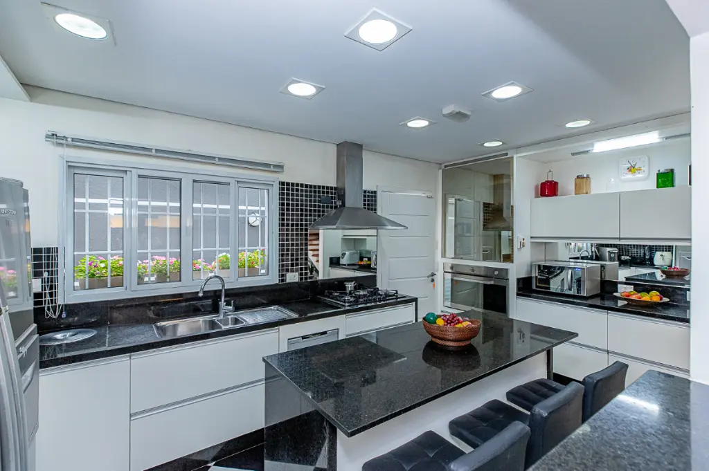 A cozinha espaçosa, ventilada e iluminada, para o preparo de suas refeições, conta também com uma ilha central.