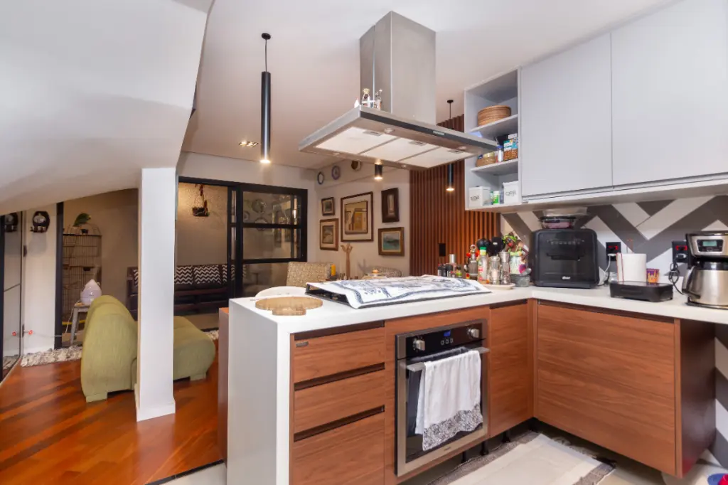Sala com cozinha americana e quintal integrado