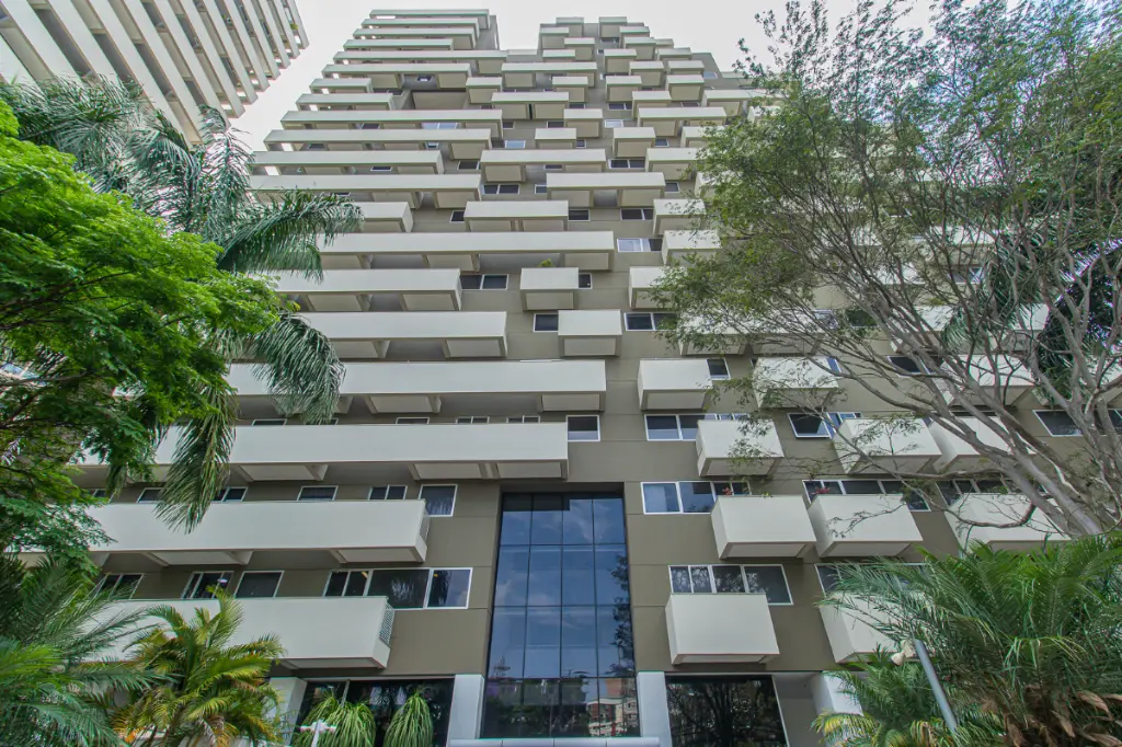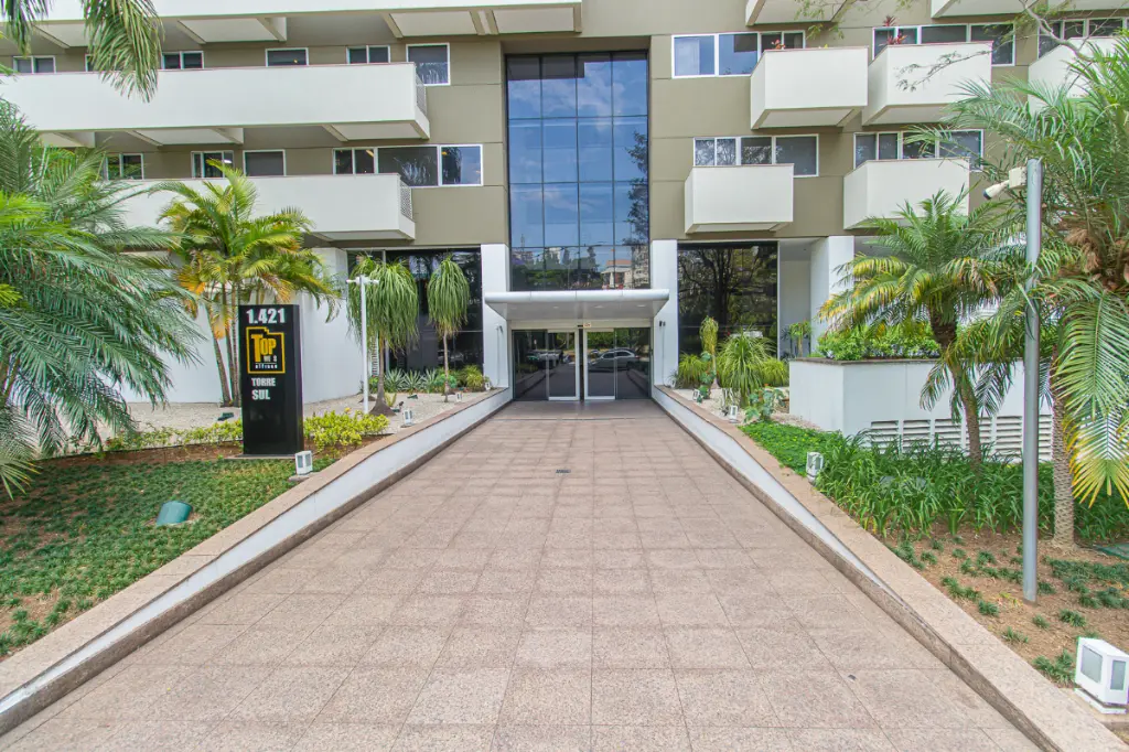 Edifício moderno com portaria 24h e controle de acesso.