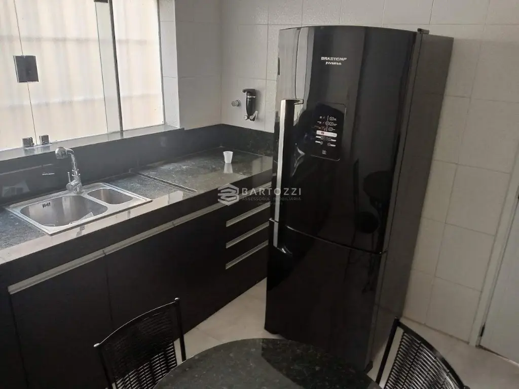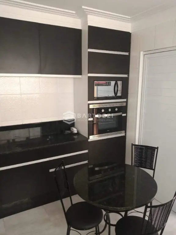 * Cozinha planejada com cooktop, 2 fornos, micro-ondas, geladeira, mesa com 4 cadeiras