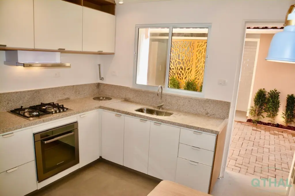 Cozinha completa com armários, fogão, coifa e filtro de água, além de nichos para geladeira e micro-ondas.