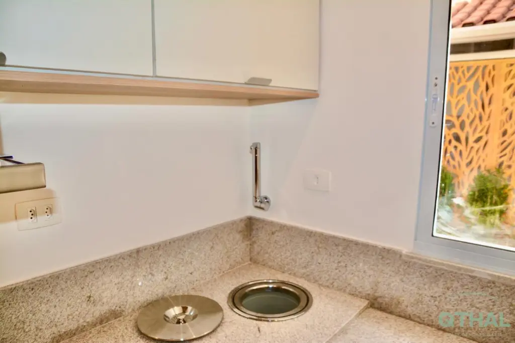 A lavanderia possui armários e varal de teto, tanque e bancada para acomodar máquina de lavarsecar.