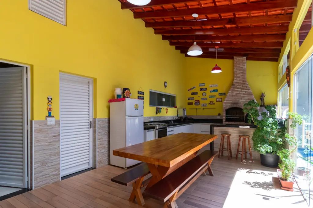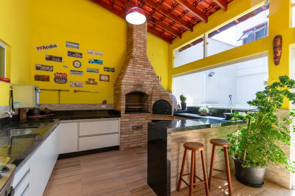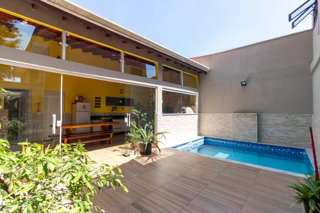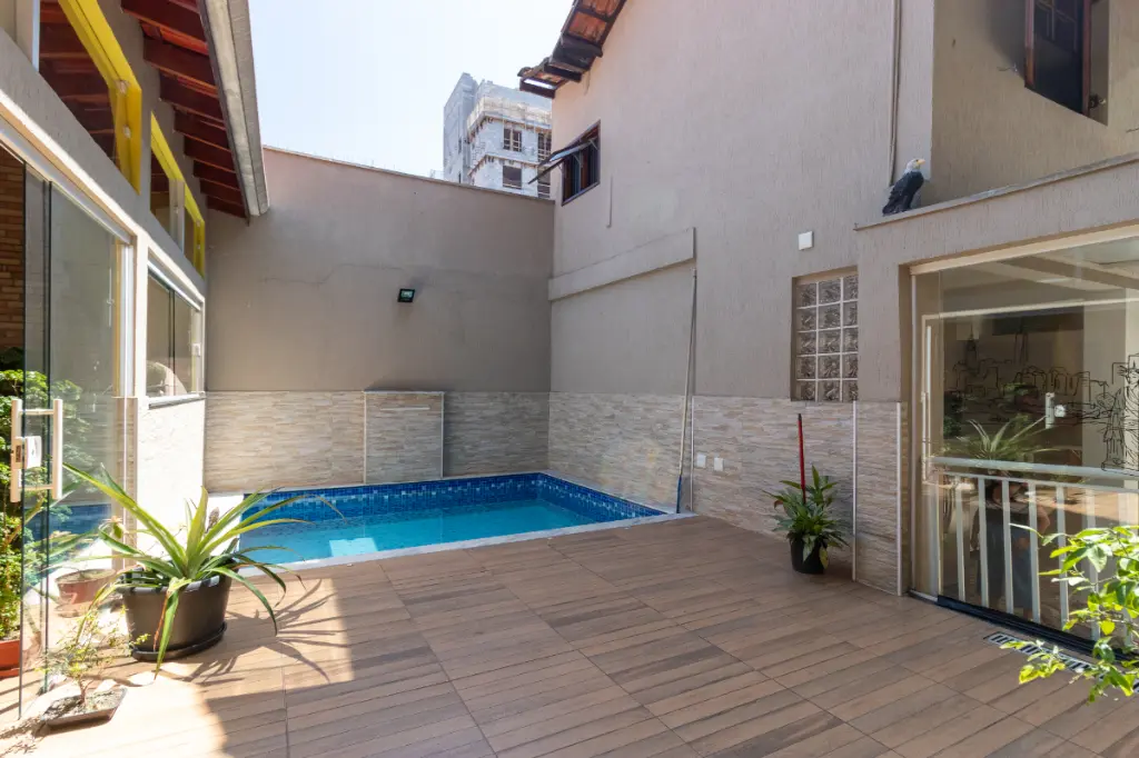 Na parte externa, o sobrado entrega aquilo que toda família procura: um verdadeiro refúgio dentro de casa. A área de lazer é composta por uma piscina, perfeita para os dias quentes, e um espaço gourmet amplo e completo, equipado com churrasqueira e forno à lenha o cenário ideal para encontros especiais e celebrações inesquecíveis. O imóvel ainda disponibiliza 2 vagas de garagem, uma área grande de depósito e um banheiro exclusivo para atender à área de lazer.