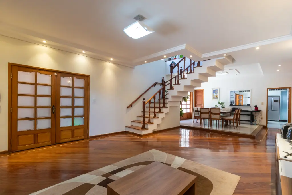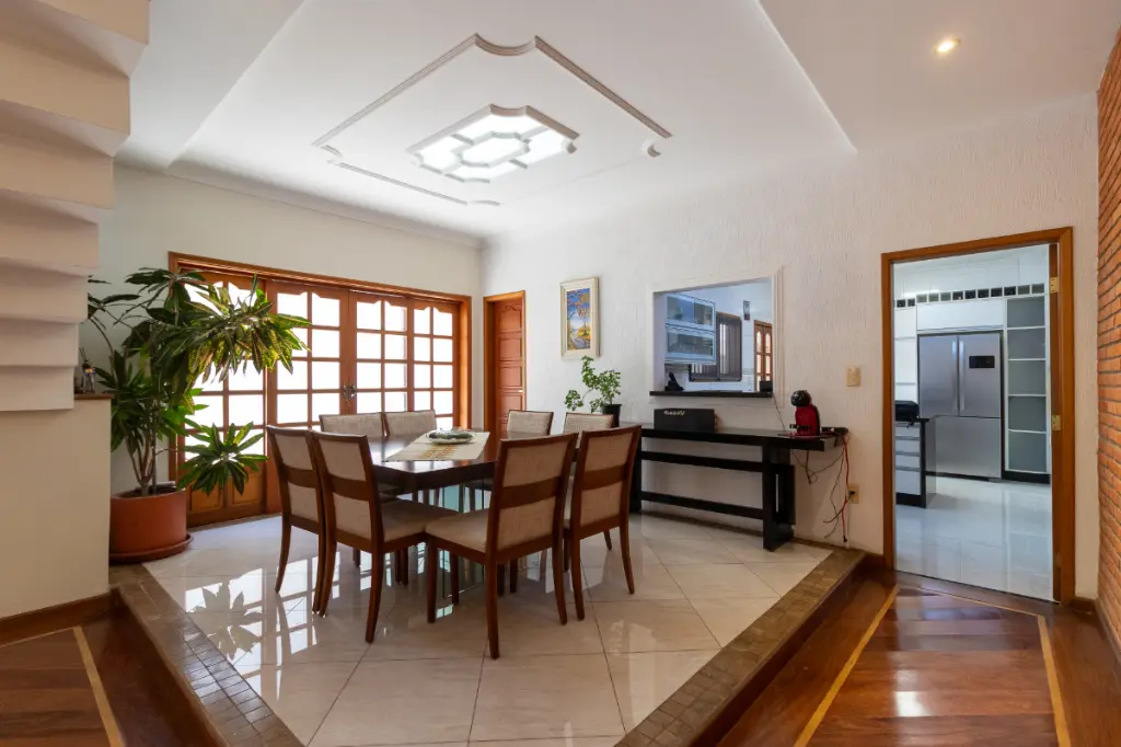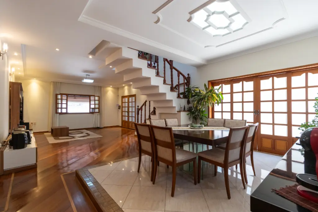 No piso principal, a sala de estar integrada à sala de jantar cria um ambiente social moderno, perfeito para quem gosta de receber amigos ou simplesmente desfrutar de momentos tranquilos com a família. O espaço ainda conta com um lavabo, garantindo praticidade no dia a dia. Os pisos de madeira nos dormitórios e salas trazem aconchego e elegância, enquanto os móveis planejados de alta qualidade valorizam o design e otimizam o uso de cada ambiente.