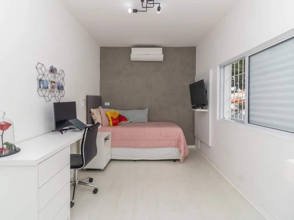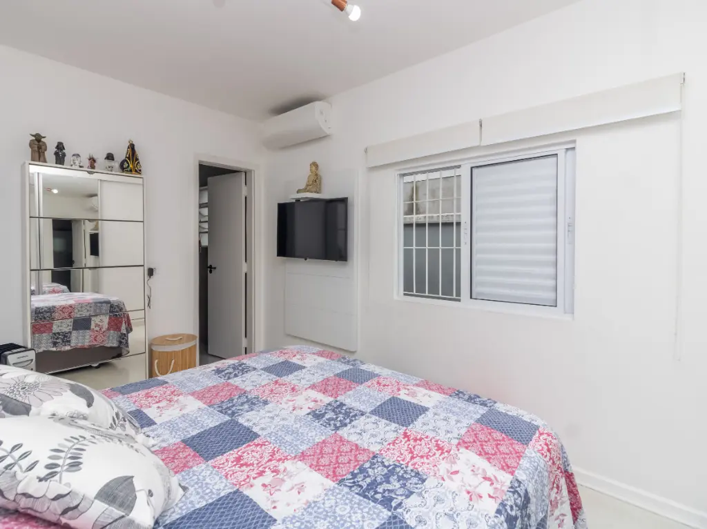 ? Dormitórios generosos, com armários planejados em madeira e ar-condicionado