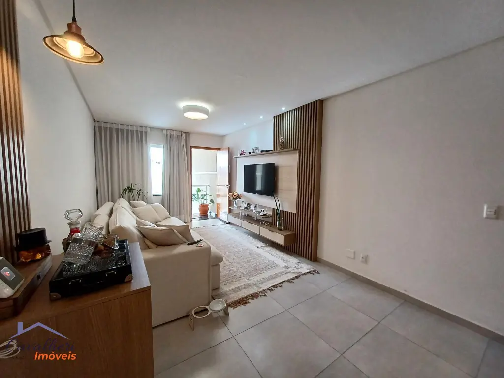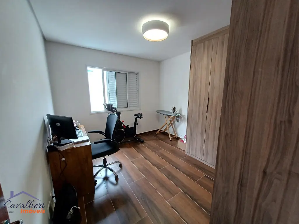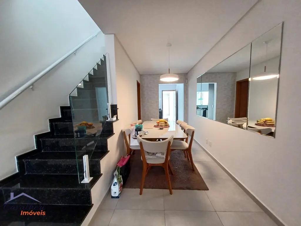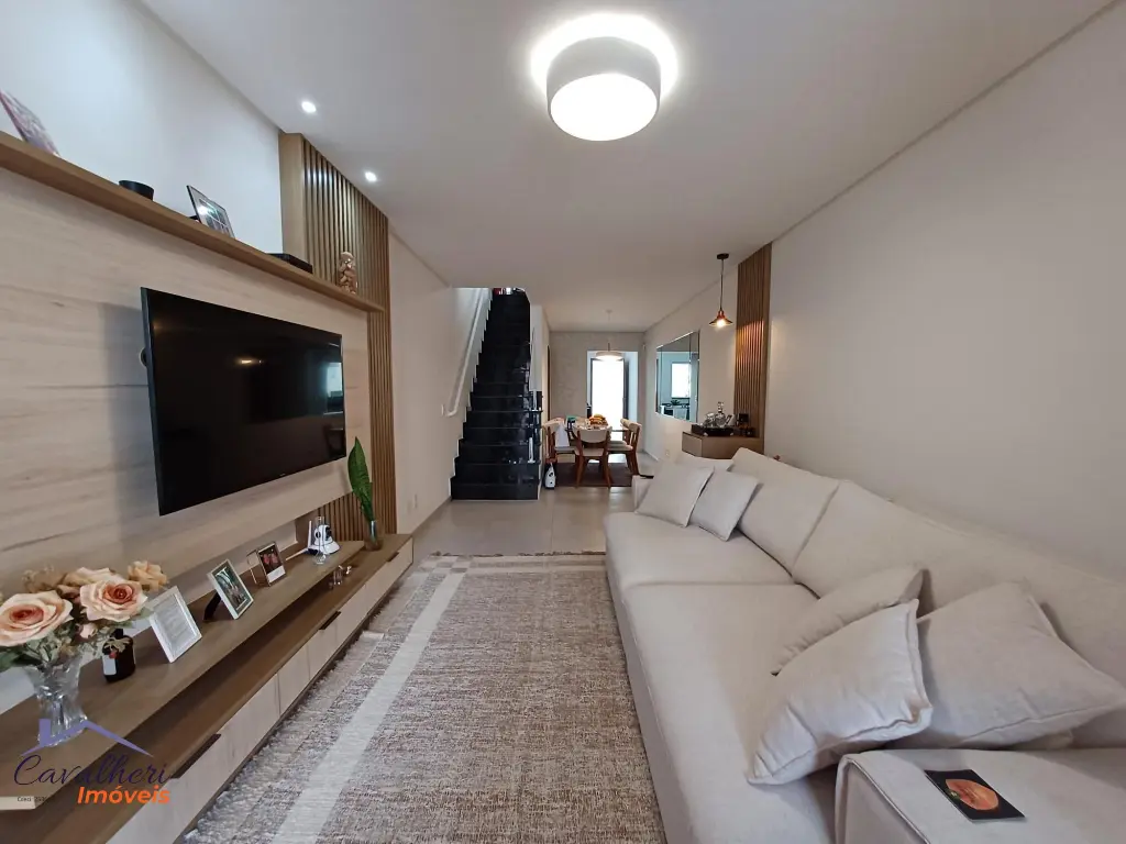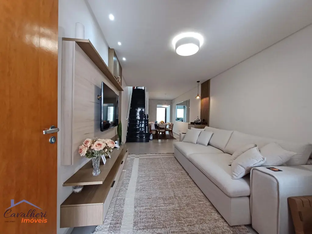 3 dormitórios com armários sendo 1 com suíte e varanda, sala 2 ambientes com lavabo, banheiro com gabinete, cozinha com armários, área de serviço coberta com teto de vidro retrátil, quintal e 2 vagas.
