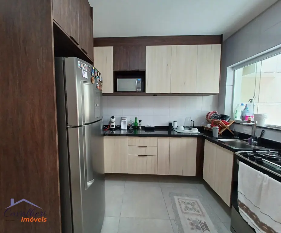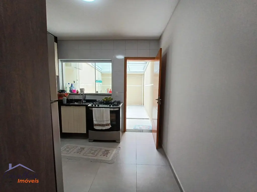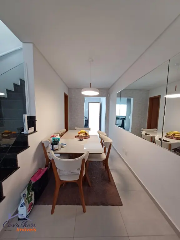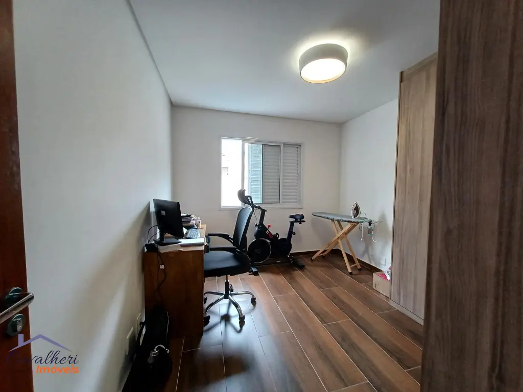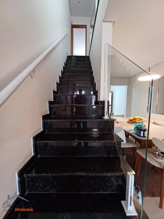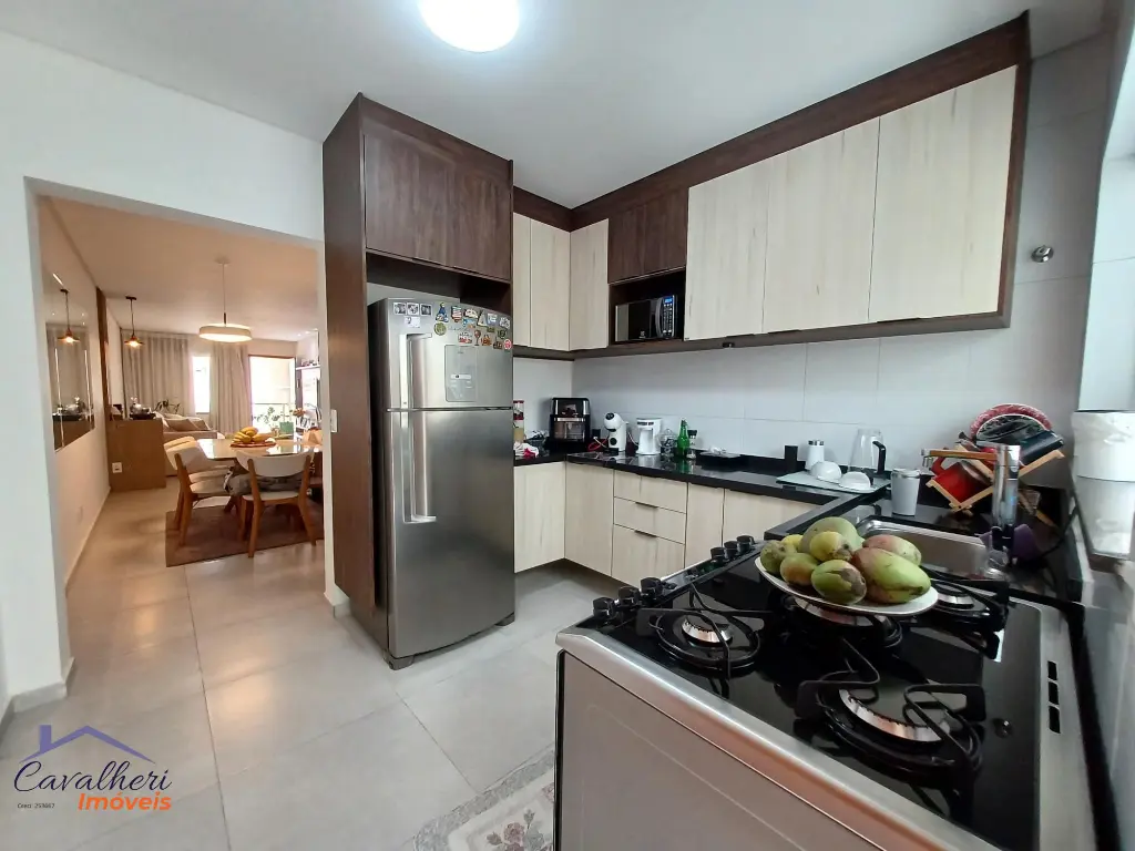 3 dormitórios com armários sendo 1 com suíte e varanda, sala 2 ambientes com lavabo, banheiro com gabinete, cozinha com armários, área de serviço coberta com teto de vidro retrátil, quintal e 2 vagas.