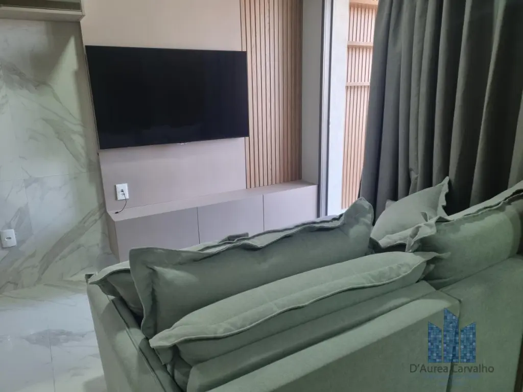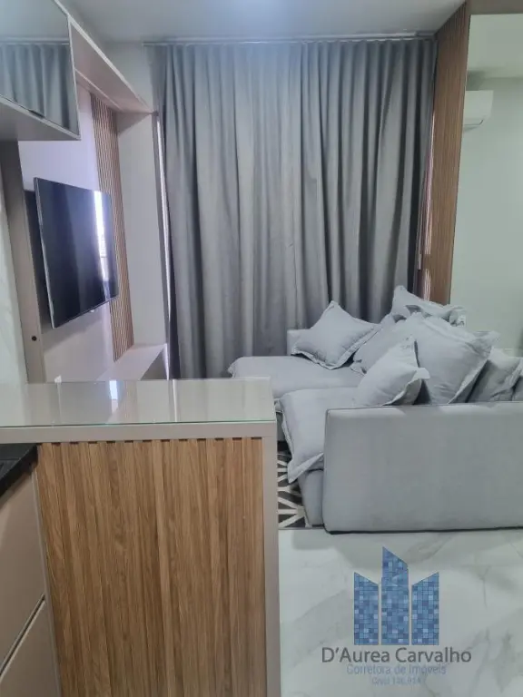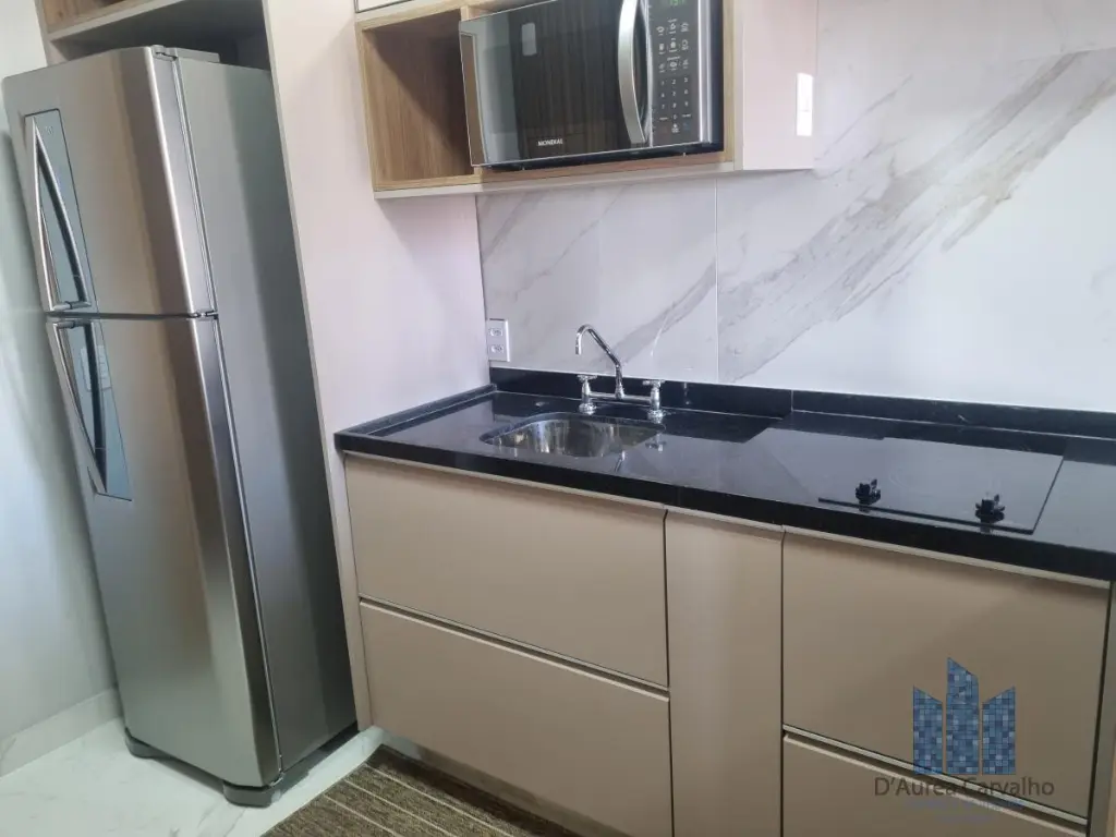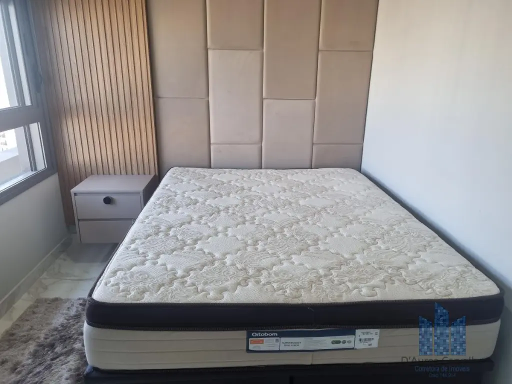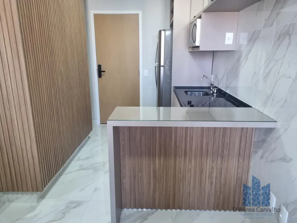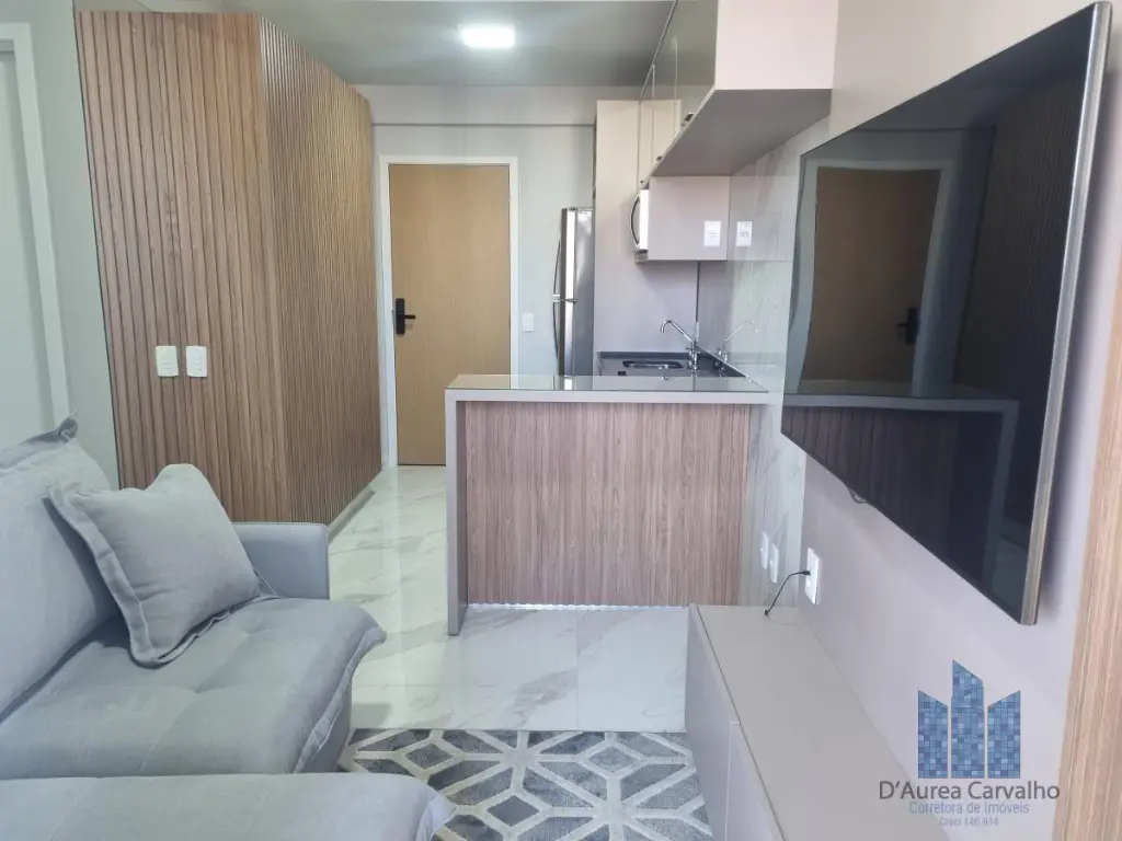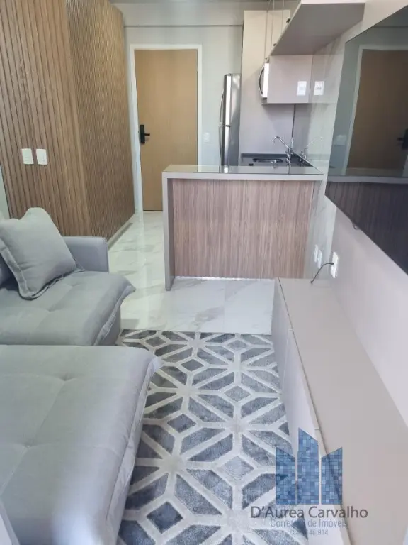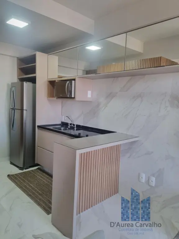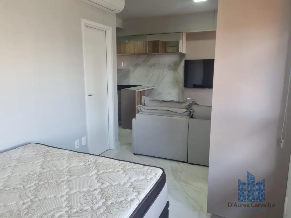 Apartamento decorado, localizado no décimo segundo andar com boa ventilação e luminosidade. Possui dormitório integrado ao living com varanda, banheiro social e cozinha americana. Há uma vaga de garagem.