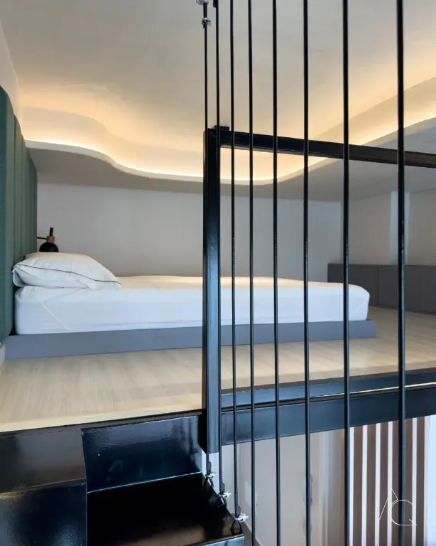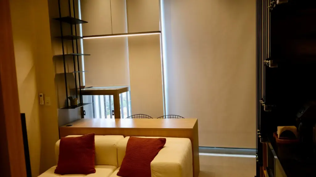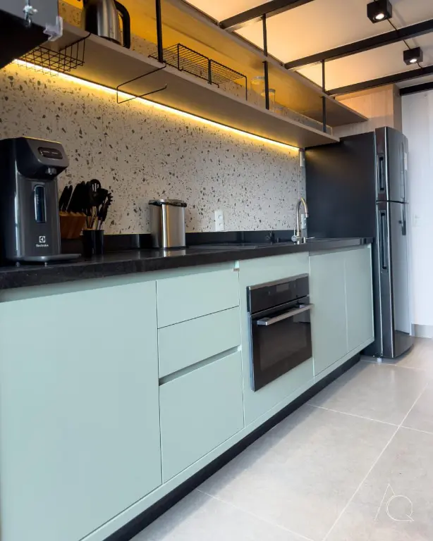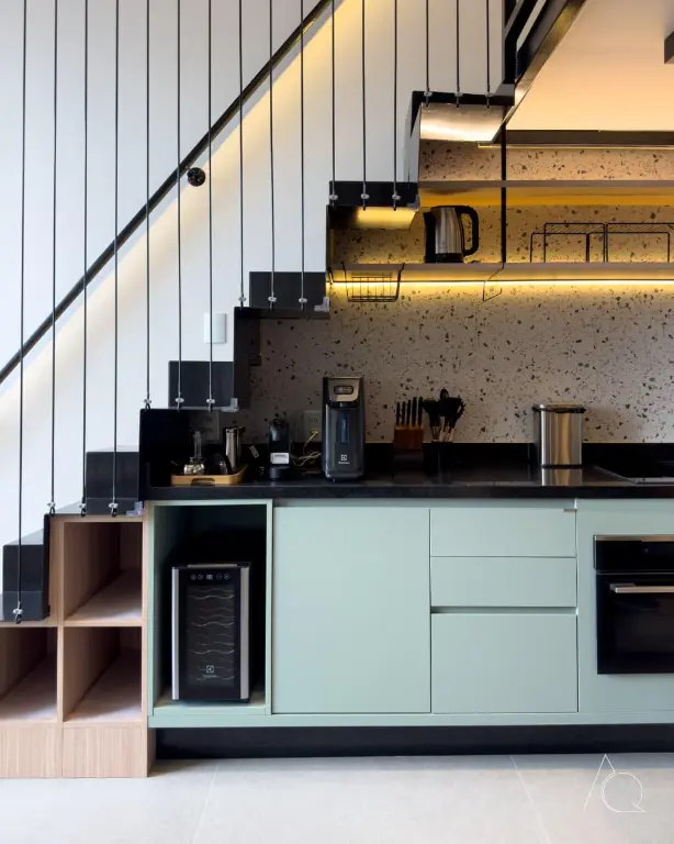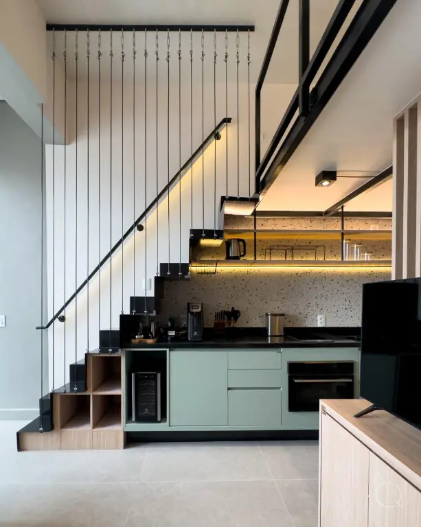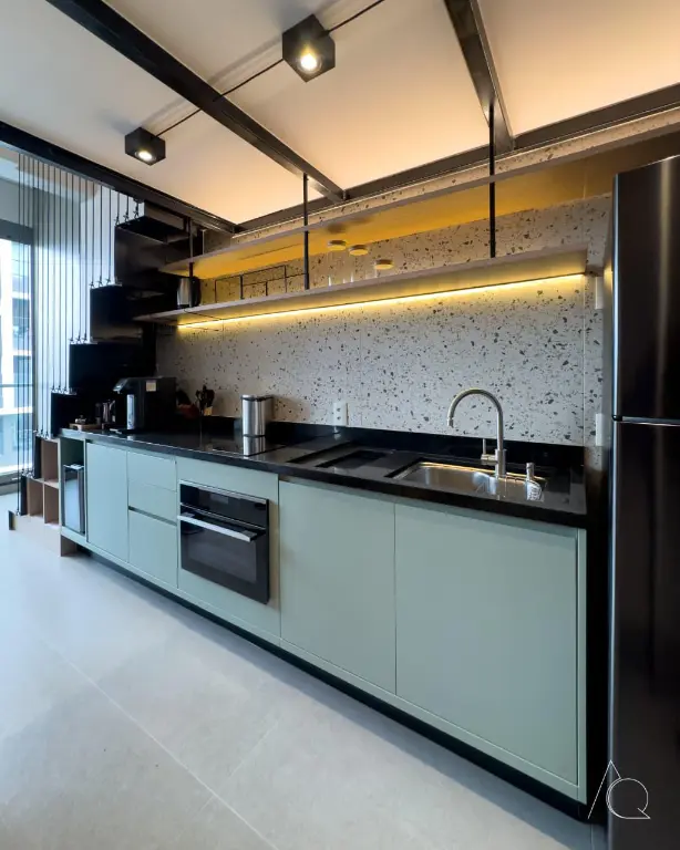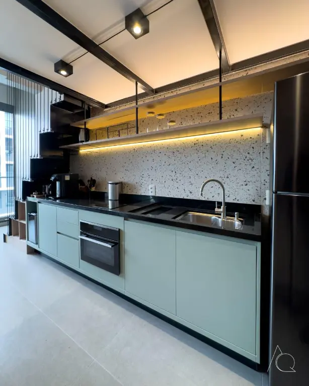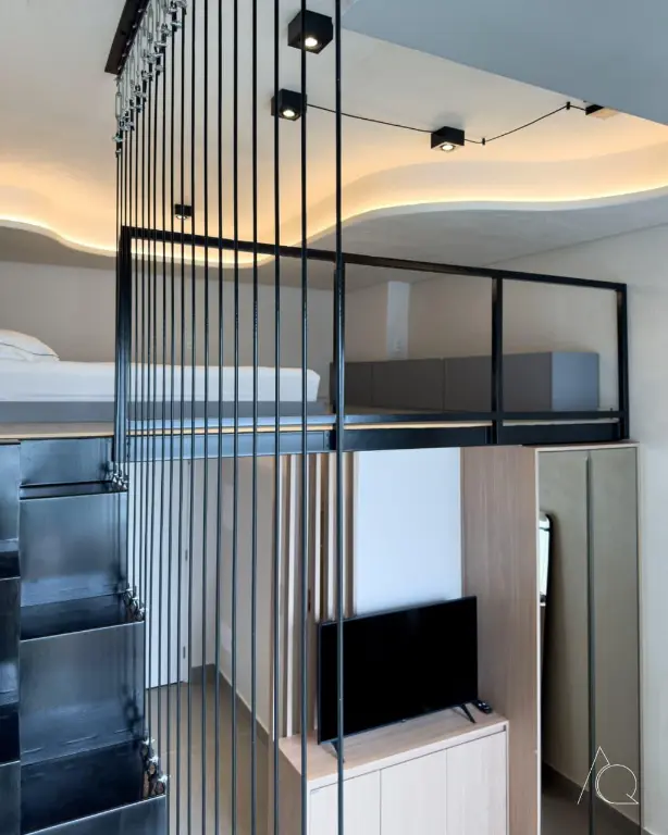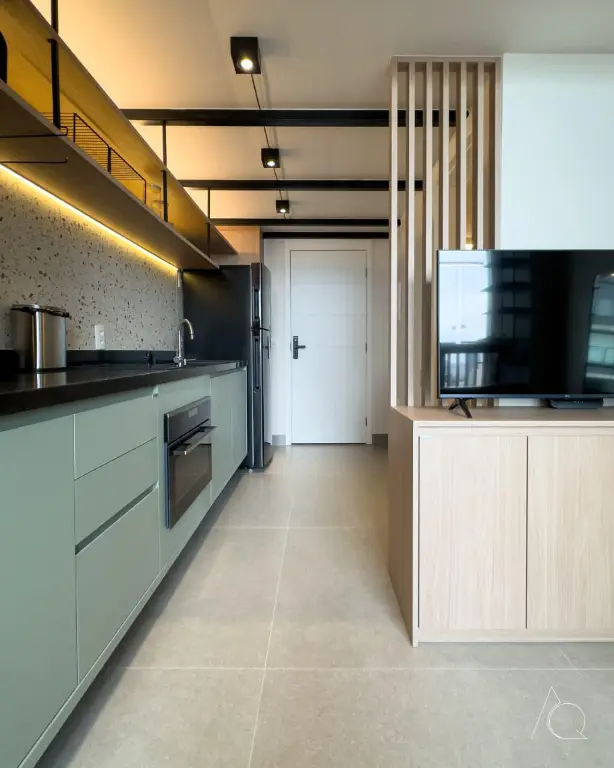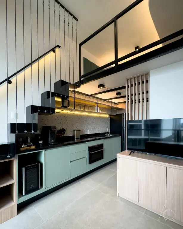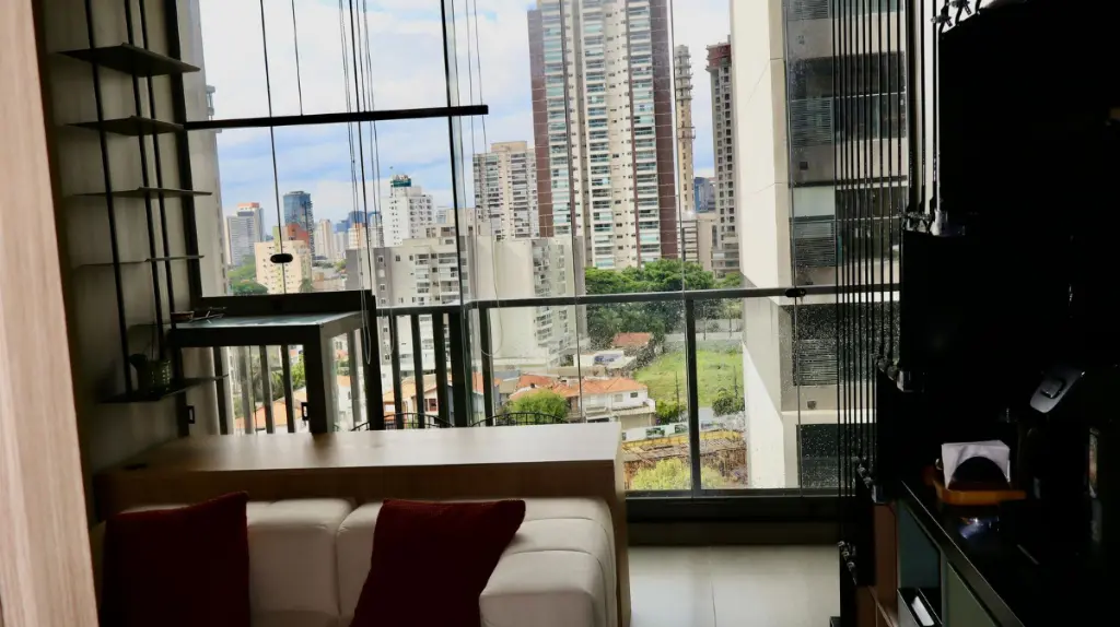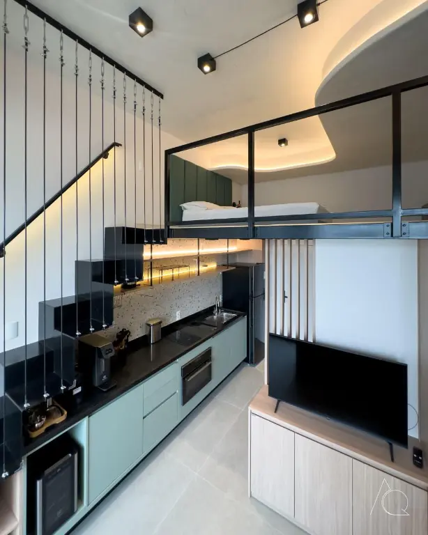 O apartamento conta com um dormitório, um banheiro e uma cozinha integrada. O ambiente é mobiliado e dispõe de móveis planejados, ar-condicionado central e janelas do tipo teto a chão, proporcionando luminosidade e amplitude e um mezanino.