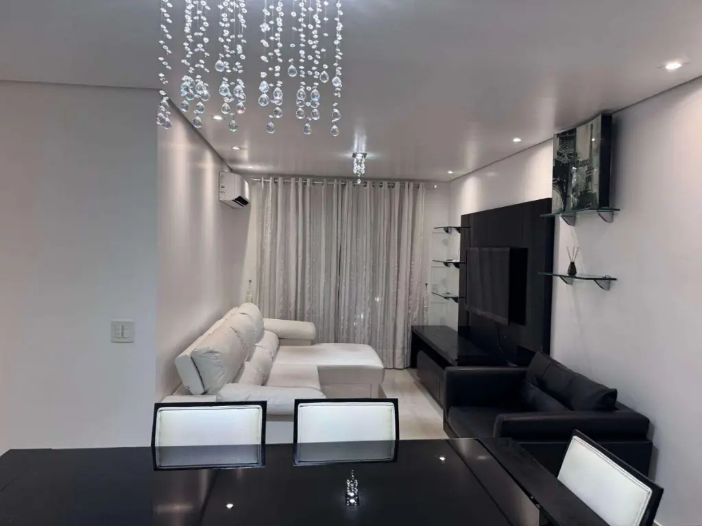 O apartamento conta com 74m² totalmente reformado com acabamento de primeira. São 2 dormitórios sendo 1 suíte e 2 vagas de garagem. O imóvel está mobiliado com armários planejados, cooktop e forno, geladeira, forno microondas, ar-condicionado em todos os ambientes, lava e seca, mesa de jantar, televisor na sala de estar, sacada envidrac¸ada com vista. Água e gás individualizados.