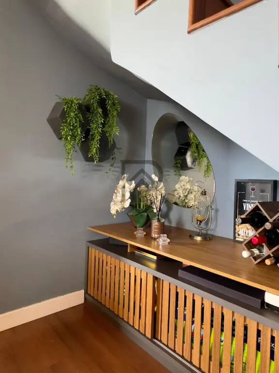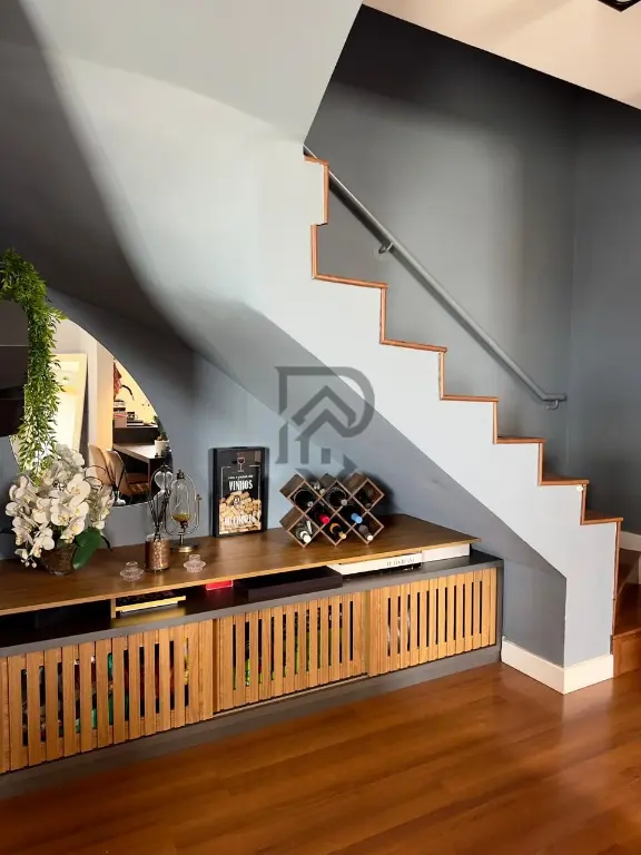 Na parte inferior, sala ampla, lavabo, cozinha, lavanderia e sacada externa.