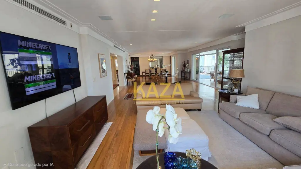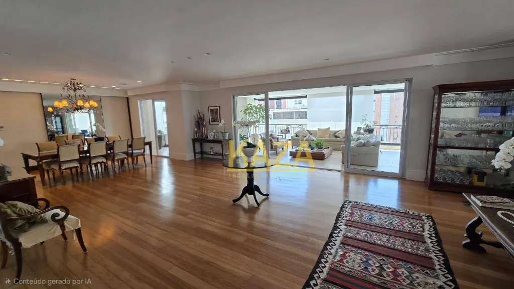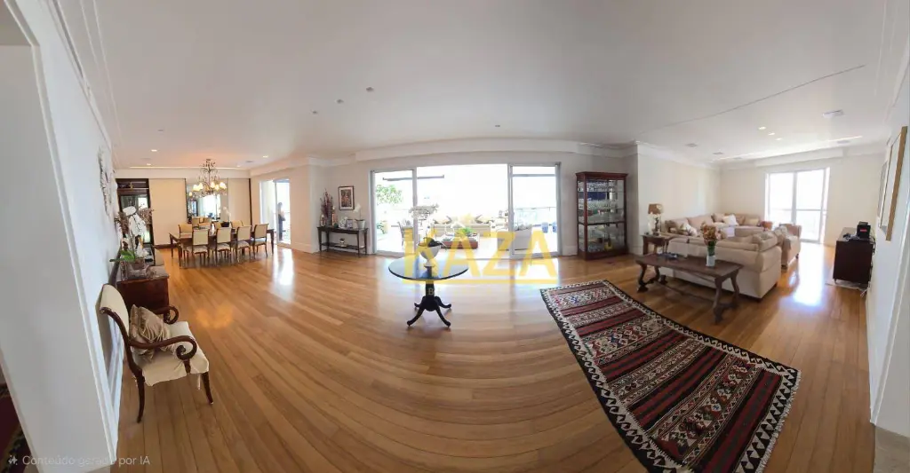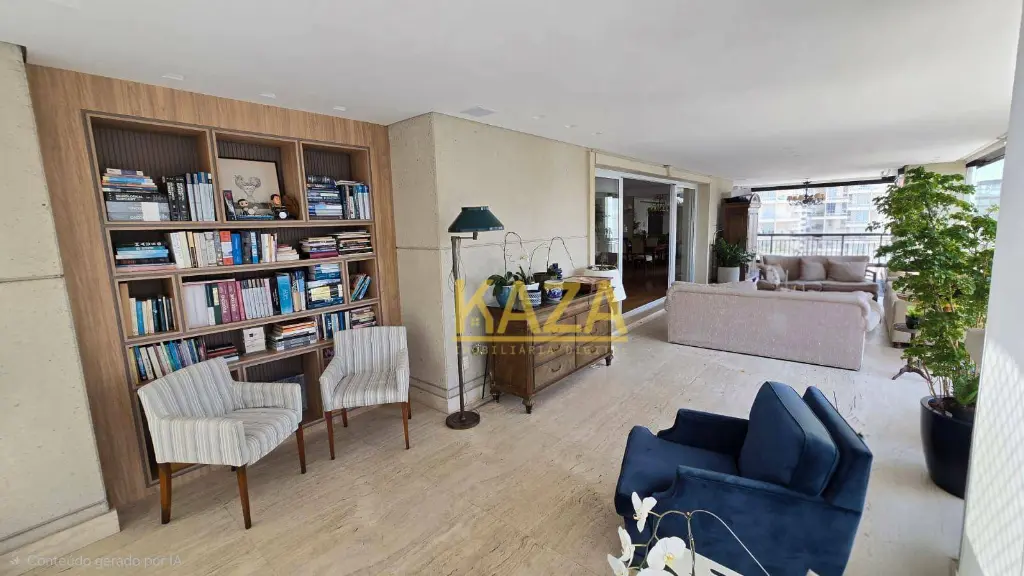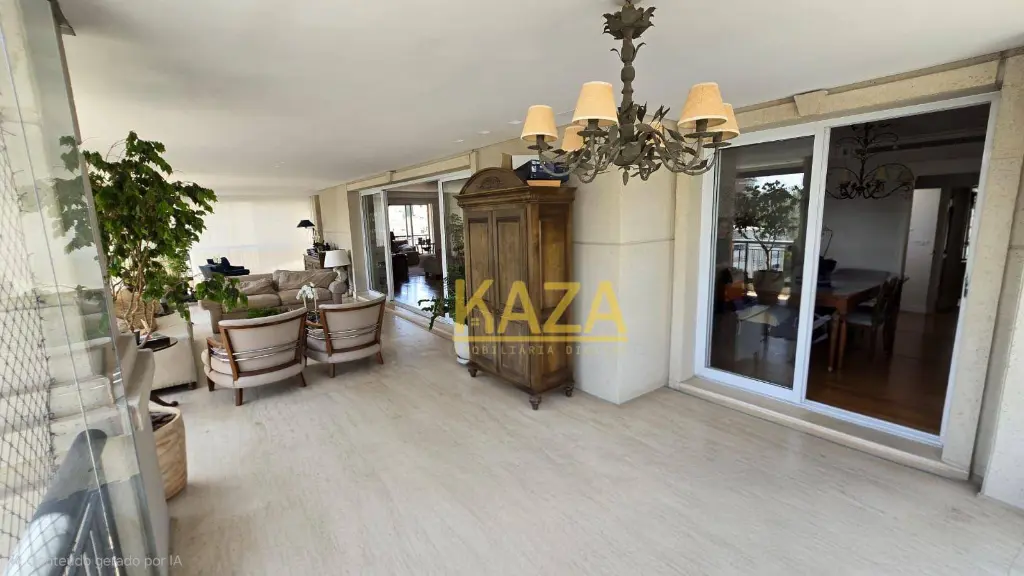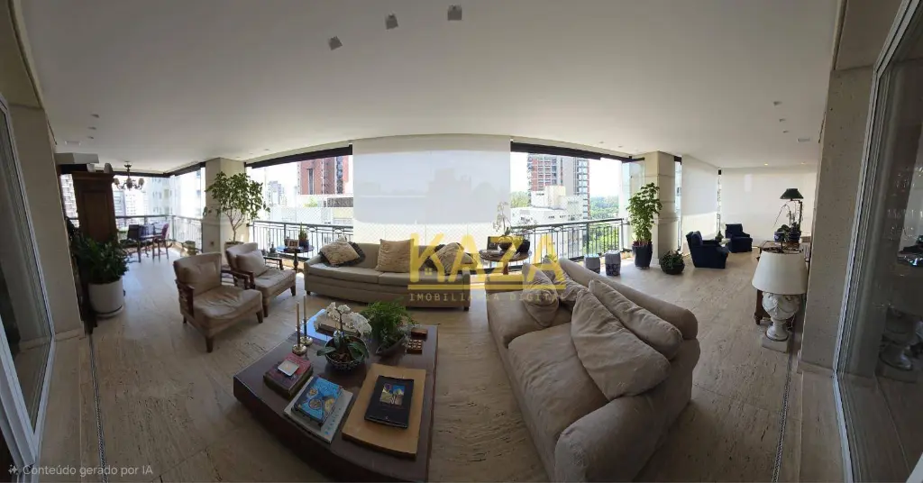 Com 401 m² privativos (606 m² totais), a planta oferece proporções generosas e fluidez impecável entre os ambientes. A reforma criteriosa com acabamentos em travertino romano imprime elegância atemporal, sem excessos.