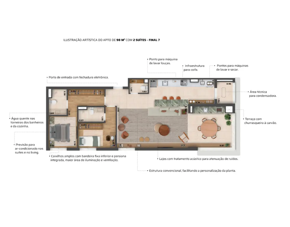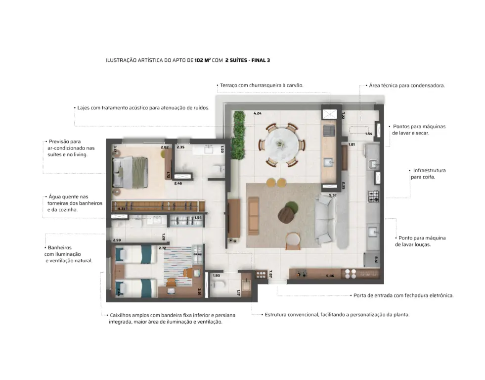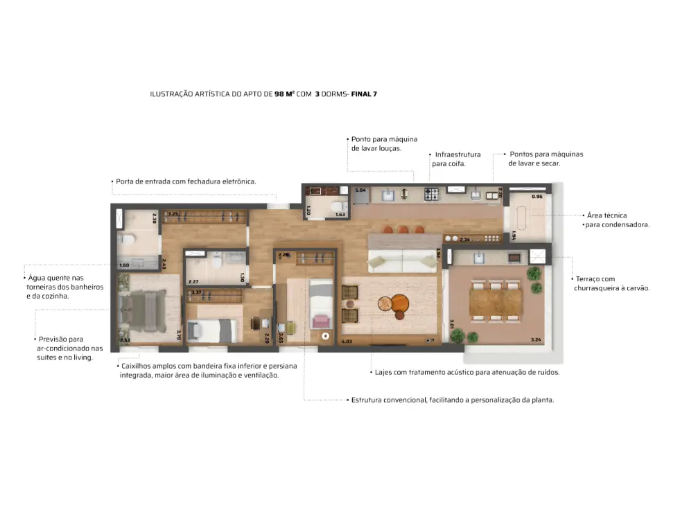 Aptos de 102 e 98 m2 com 3 dormitórios..1 suíte e 2 vagas, churrasqueira a carvão na varanda..etc.