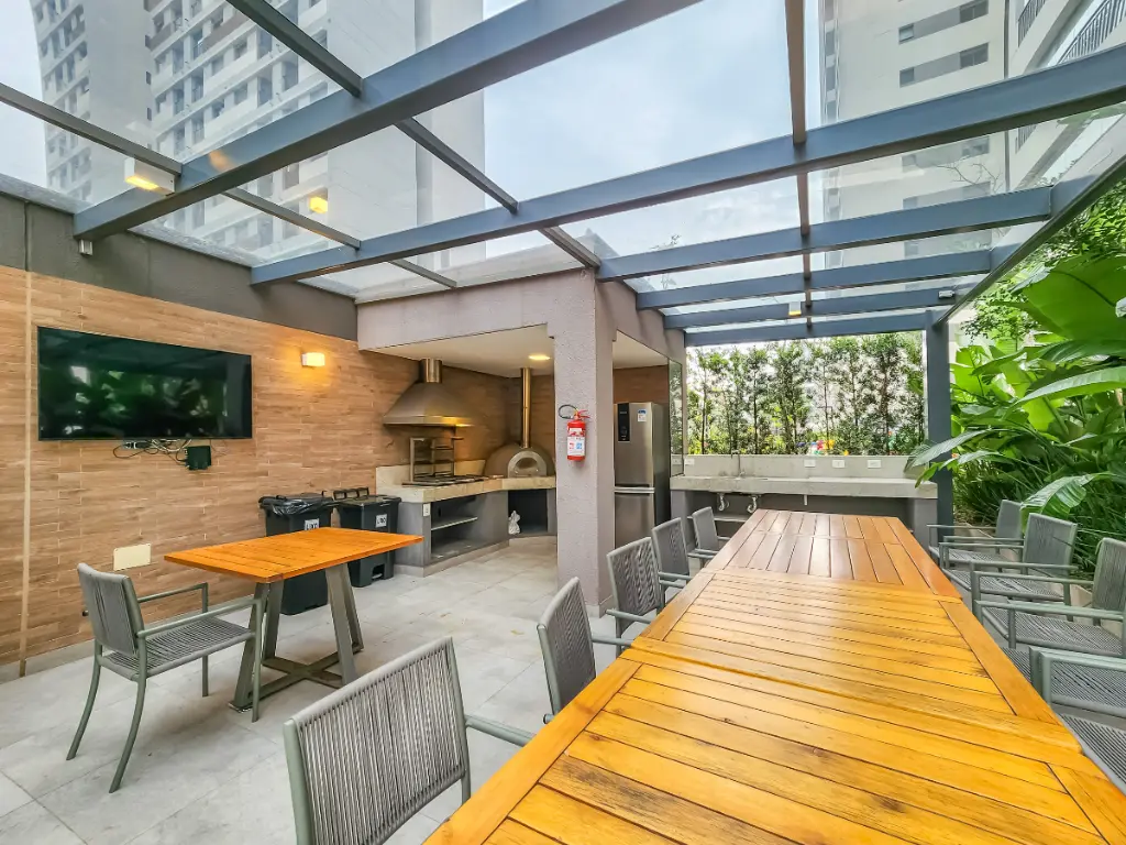 Na parte social do imóvel, temos um deslumbrante living, cozinha, e varanda gourmet com churrasqueira a carvão e vista permanente.