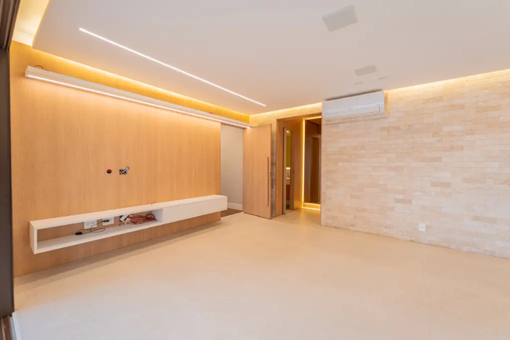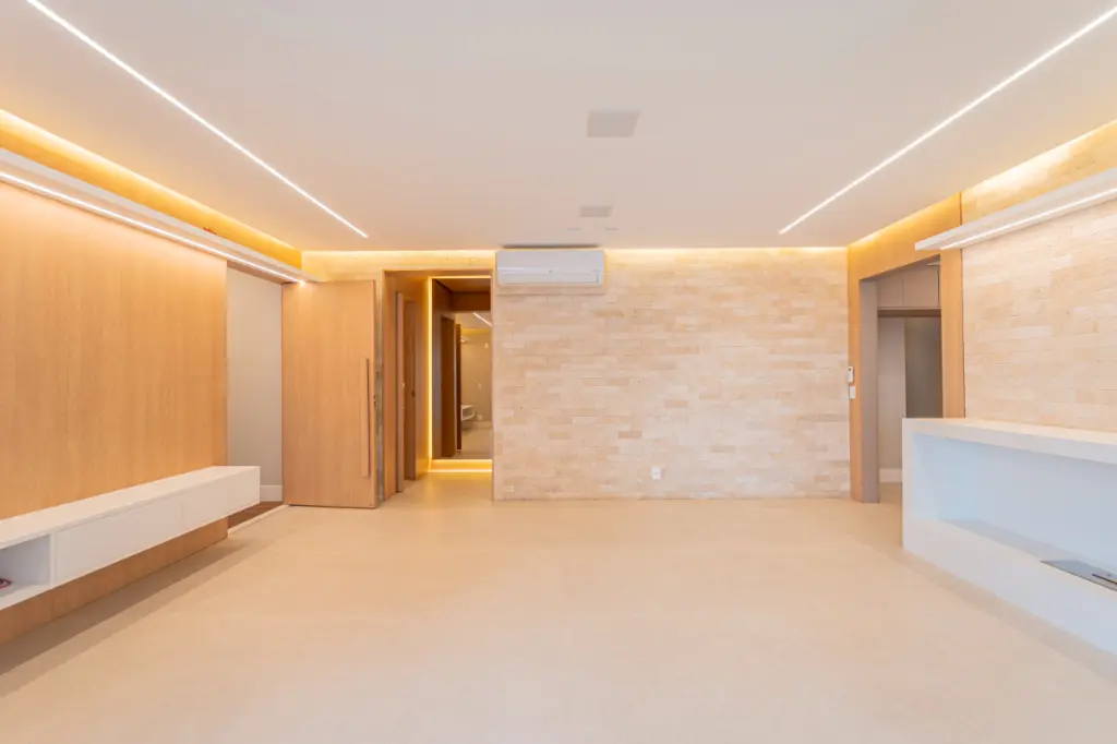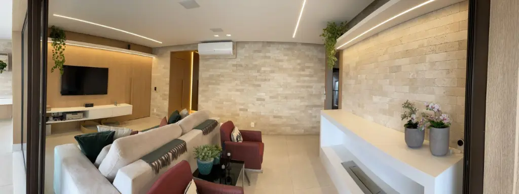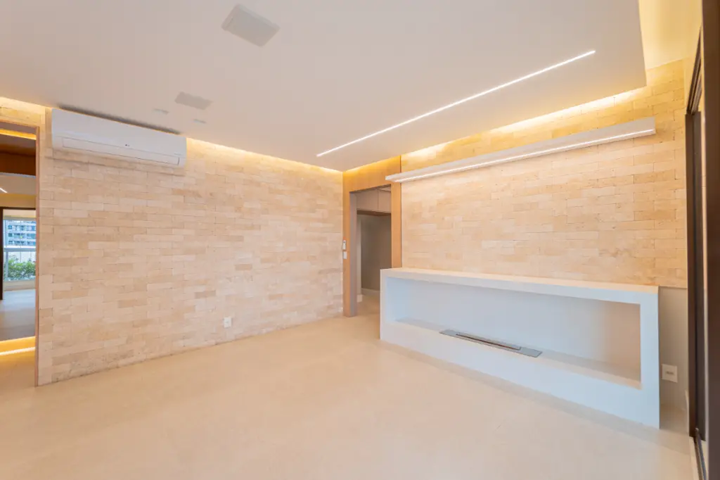 O living é bastante espaçoso para três ambientes como sala de jantar, TV e sala de estar, com uma charmosa lareira ecológica com controle remoto. Um elegante lavabo, deixa o ambiente ainda mais funcional.