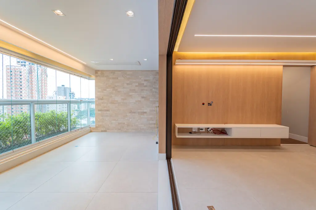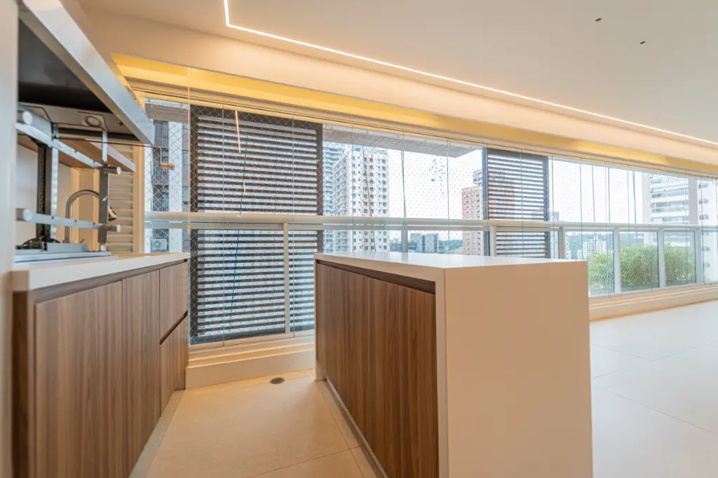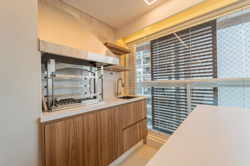 A varanda gourmet e sua conexão com a cozinha, iluminada pelo sol da manhã é um dos ambientes mais desejados nesse apartamento. A churrasqueira a carvão com design moderno na versão elevatória da marca Polytec e coifa com excelente exaustor, são diferenciais de extrema qualidade. O envidraçamento com tecnologia moderna torna esse espaço perfeito para confraternizar com amigos e familiares em qualquer época do ano e desfrutar de momentos de relaxamento com uma agradável vista para o bairro.