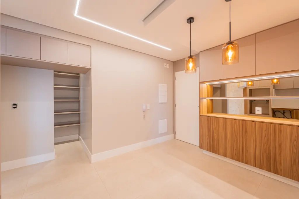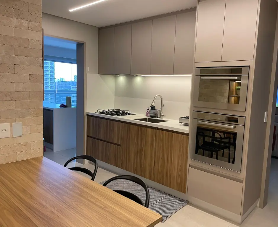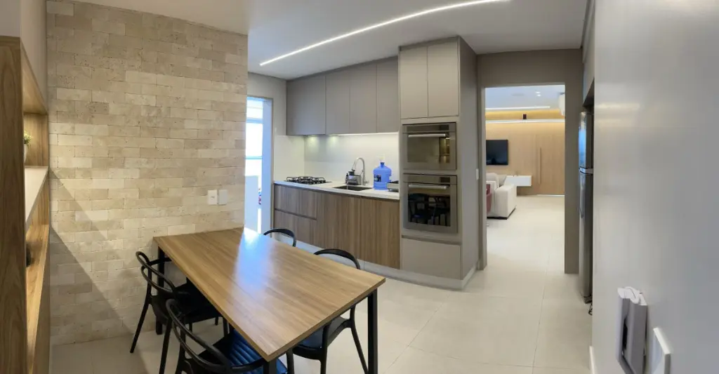 A cozinha com grande despensa, o que certamente é um diferencial nesse apartamento, tem móveis planejados com nichos para embutir eletrodomésticos de extremo bom gosto em tons neutros e atemporais.