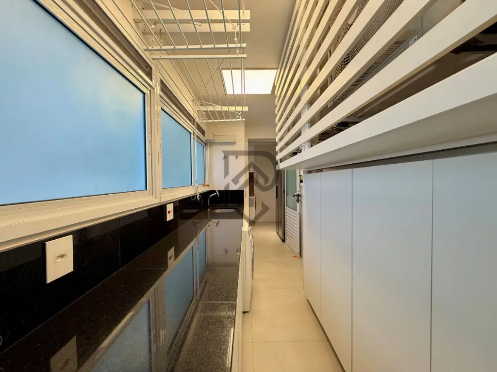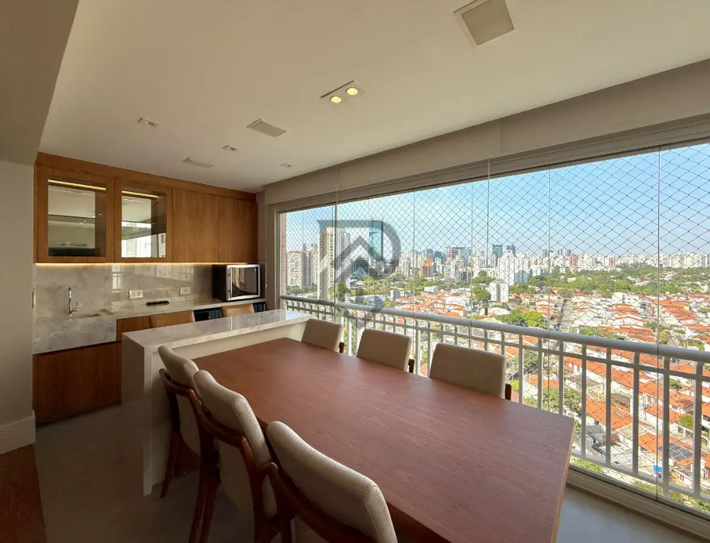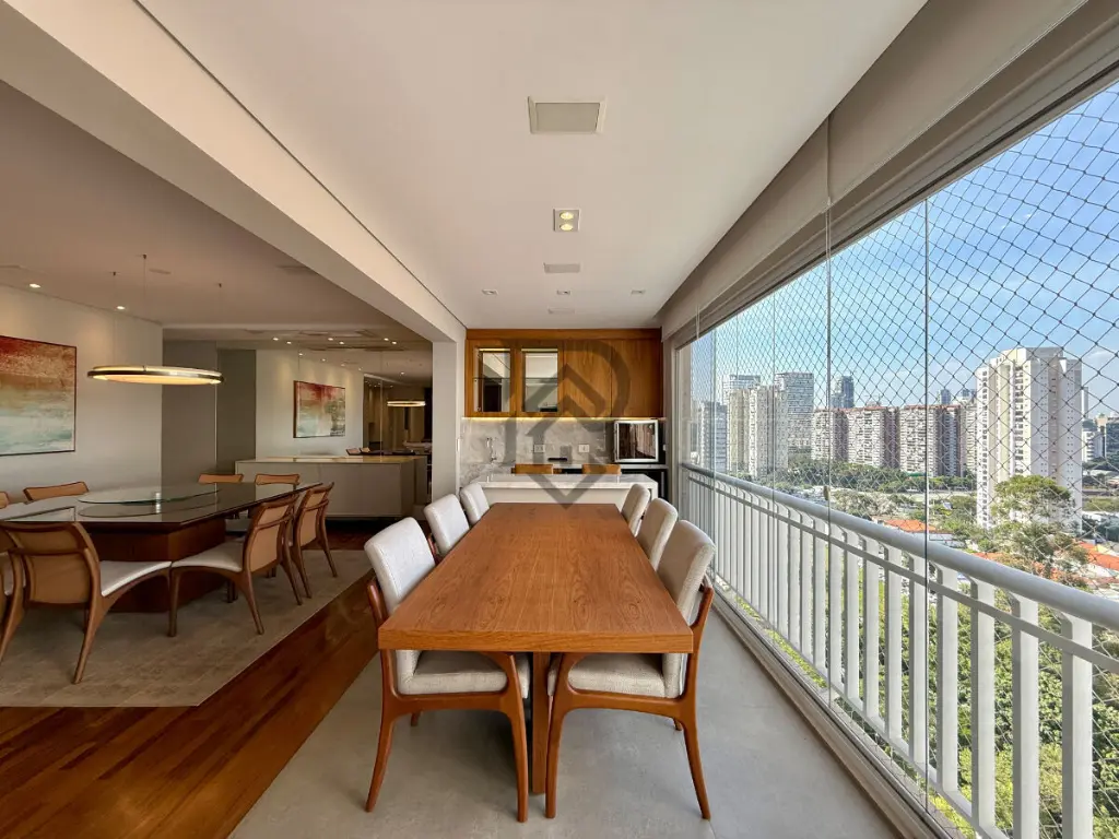 Além disto, a sala integrada com a varanda é o espaço ideal para receber amigos e compartilhar momentos inesquecíveis. Ela esta totalmente equipada com ar condicionado, TV, sistema de som com receiver e projeto de iluminação moderno deixando a ambiente mais confortável. A varanda esta fechada com vidros e cortinas rolos, que permitem desfrutar da belíssima vista.