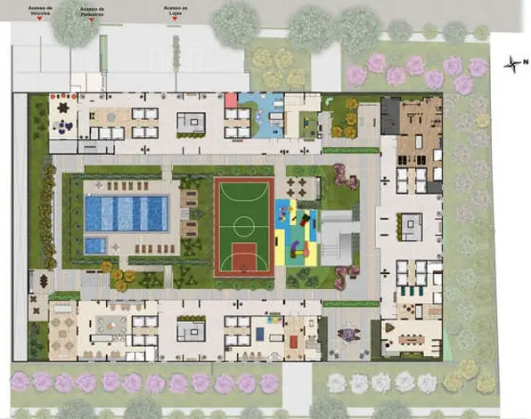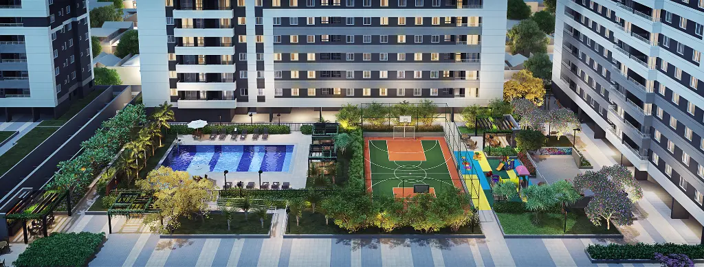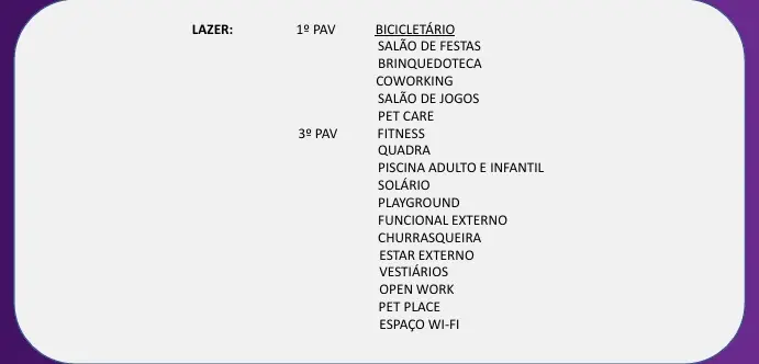 - DELIVERY / BICICLETÁRIO / ESPAÇO WIFI / BRINQUEDOTECA / PET CARE / PET PLACE / FUNCIONAL EXTERNO / FITNESS / ESTAR EXTERNO / PISCINA INFANTIL / SOLÁRIO / QUADRA / PLAYGROUND / CHURRASQUEIRA / HORTA / COWORKING / OPEN WORK / SALÃO DE JOGOS / SALÃO DE FESTAS / SKATEPARK / PONTO GRILL (unids c/TERRAÇO) / TOMADAS USB / CONSTRUÇÃO EM ALVENARIA / ENTRE TORRES: 11,91 M / PISCINA ADULTO: 17 X 8,00m - Prof. 1m14 / QUADRA RECREATIVA: 12,40m x20,40m / GÁS ENCANADO NAS UNIDADES