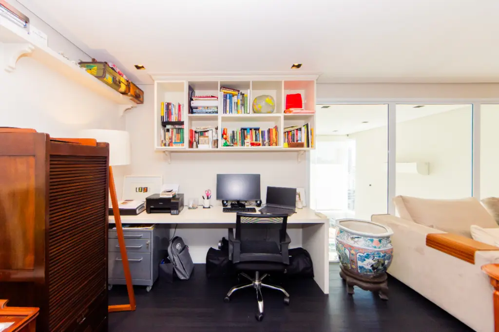 O mezanino, um dos pontos mais charmosos do projeto, foi transformado em escritório e sala de TV, criando um espaço versátil e acolhedor, que pode facilmente se adaptar às novas necessidades de quem trabalha em casa.