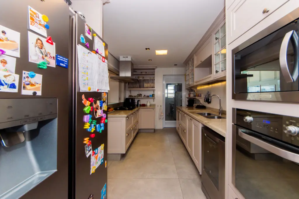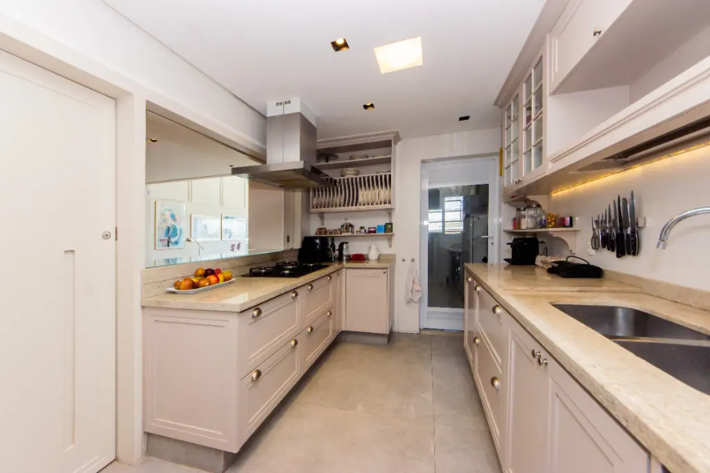 A cozinha, integrada e funcional, possui armários planejados, bancadas amplas e acabamento impecável, ideal para quem aprecia praticidade e design.