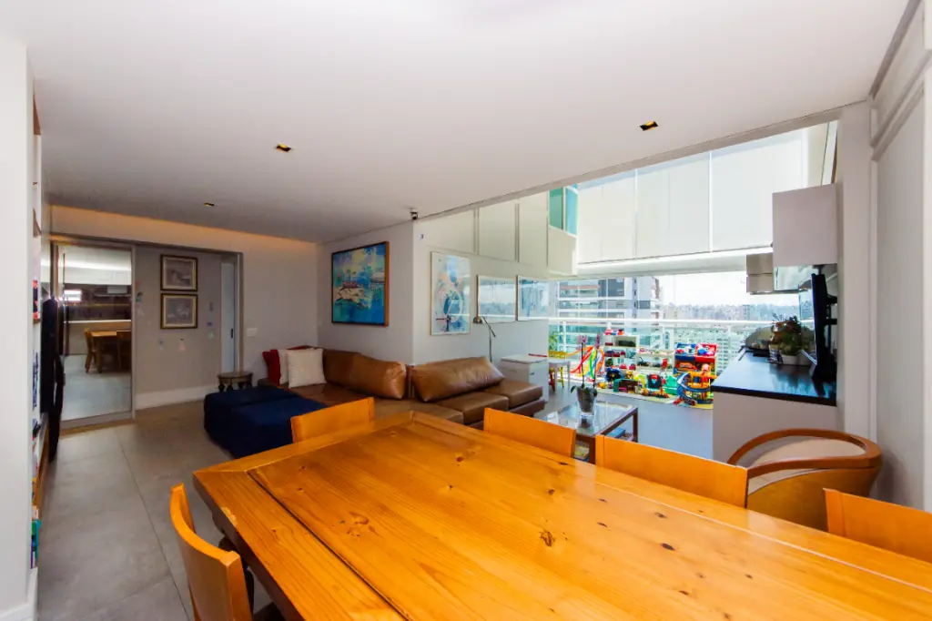 O espaço mantém a integração visual com a sala e varanda, permitindo que o ambiente seja o verdadeiro coração da casa.