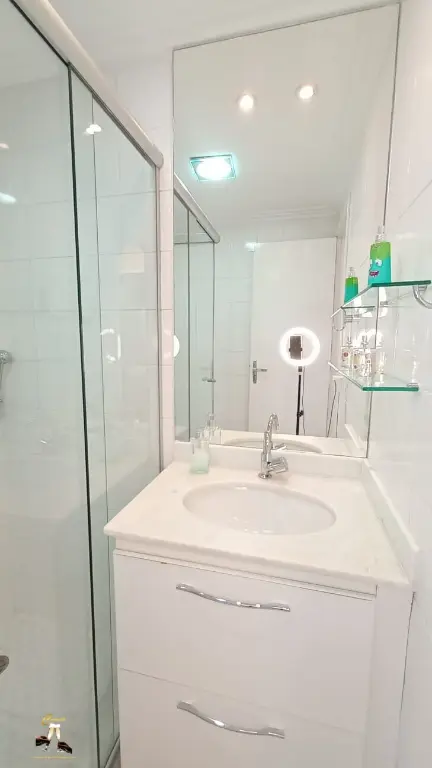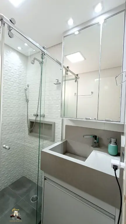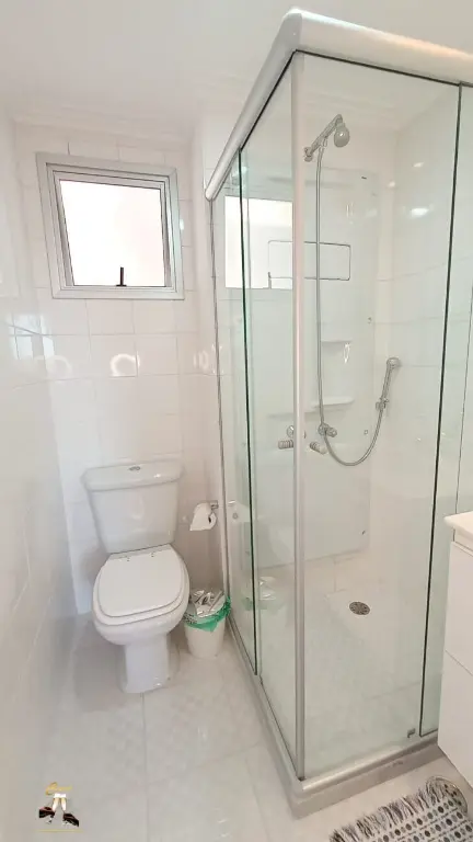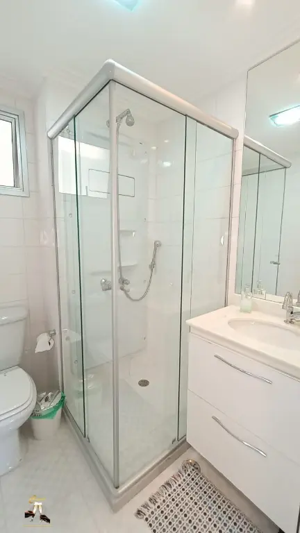 Banheiros com ventilac¸a~o natural, box de vidro com roldanas aparente, todo modernizado com louc¸as e metais novos