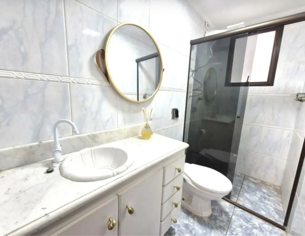 1 banheiro com box de vidro e gabinete de madeira;