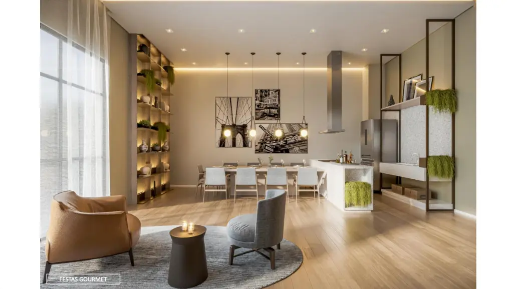Gastronomia e Social: Salão de festas de alto padrão e áreas gourmets assinadas por arquitetos renomados.