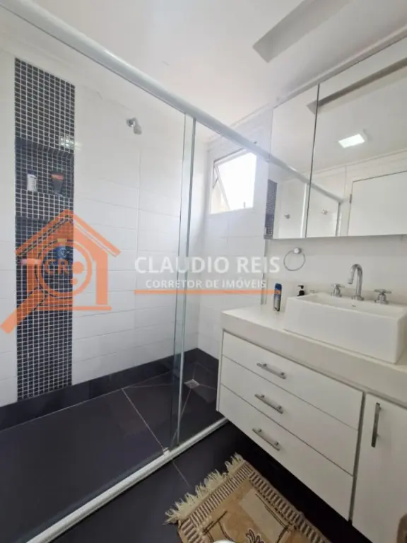 Banheiros com box de vidro, gabinete e espelho