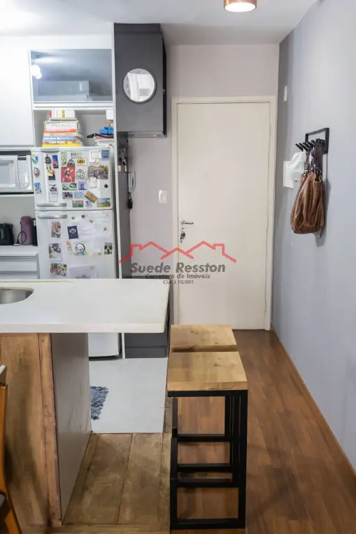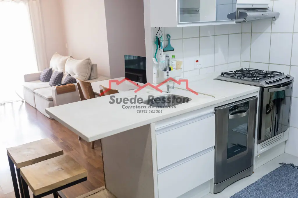 - Cozinha americana com armários planejados e bancada para café da manhã;