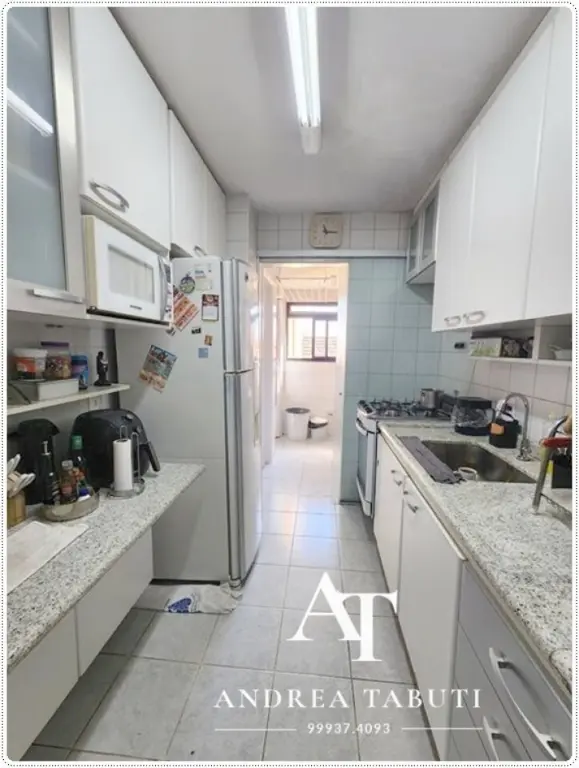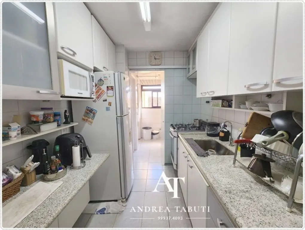 São 96m com sala ampliada (sendo possivel reverter o terceiro dormitorio), 2 vagas de garagem livre escrituradas, depósito, cozinha com armários, área de serviço, banheiro de empregada, entrada de serviço, lavabo, 2 dormitorios (sendo 1 suite).