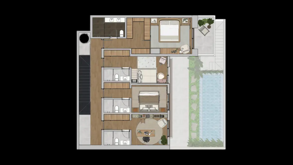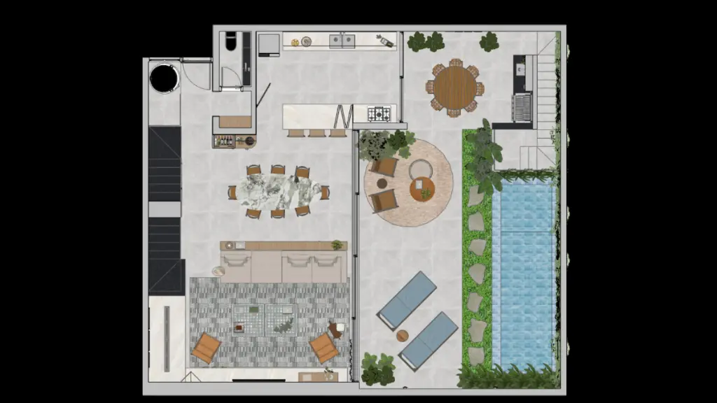 Jardim privativo com piscina e área gourmet