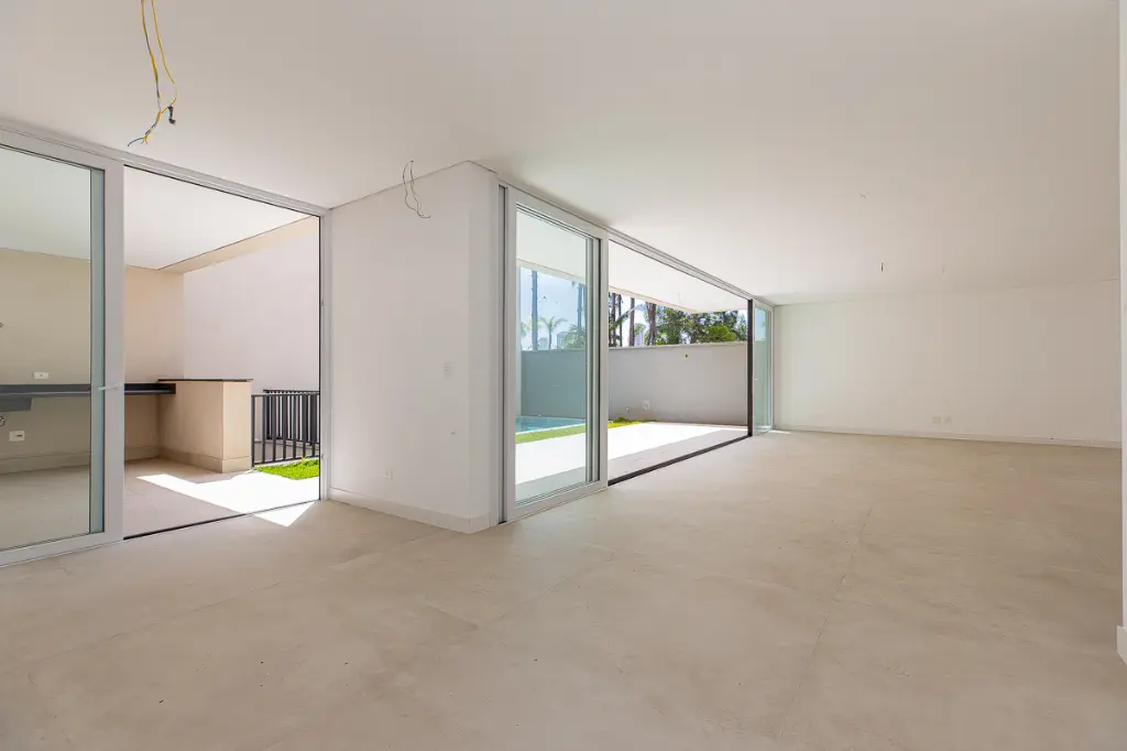 Sala de estar ampla com vista para o jardim