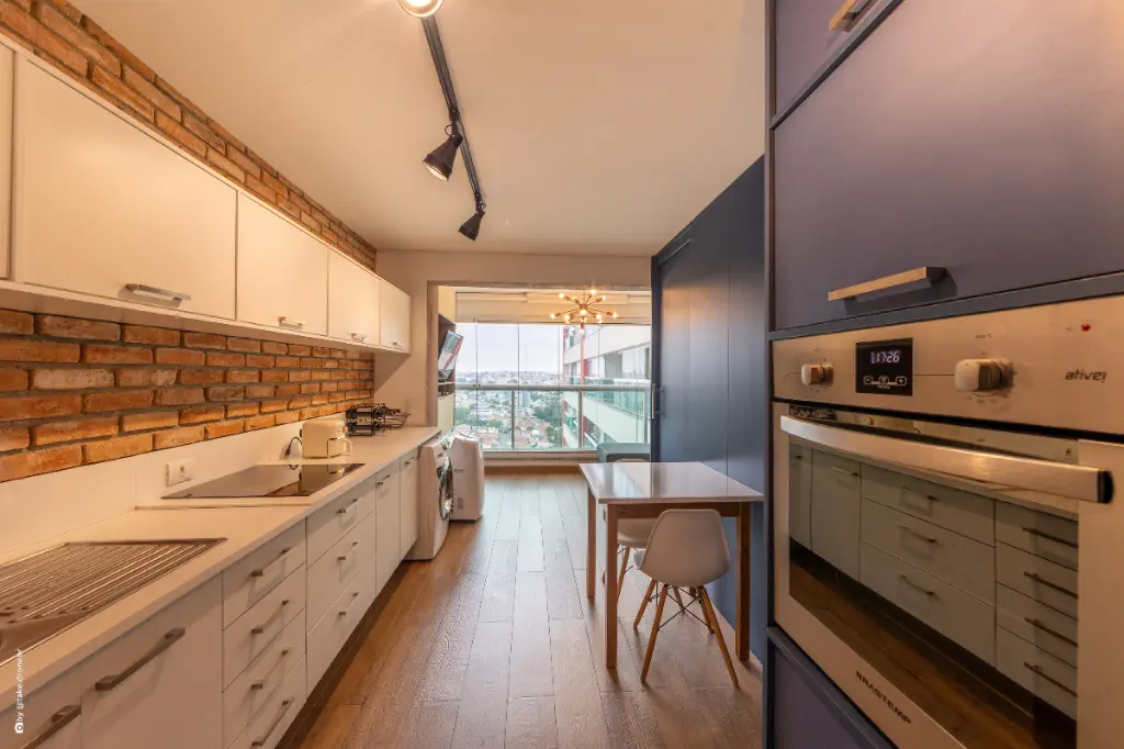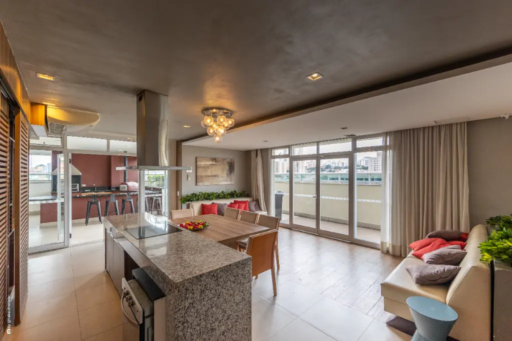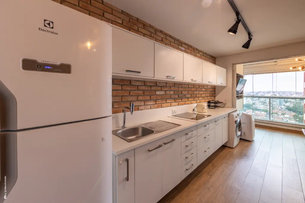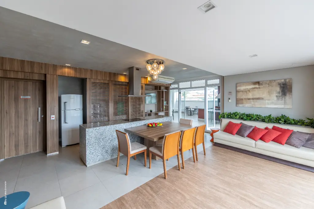 A cozinha integrada reforça a proposta contemporânea do imóvel, permitindo que o ambiente social e o espaço de preparo de refeições se conectem de forma harmoniosa. Essa integração torna o studio ideal para quem gosta de receber amigos, cozinhar com praticidade ou simplesmente desfrutar de um espaço funcional e moderno. A sala, bem iluminada e acolhedora, se estende até uma sacada com vista panorâmica, proporcionando um refúgio relaxante ao final do dia e uma atmosfera agradável para momentos de descanso.