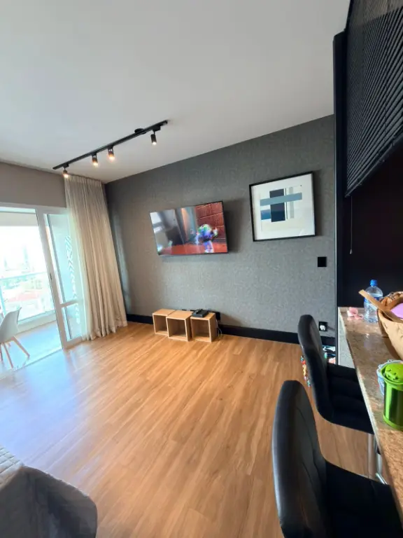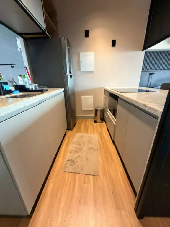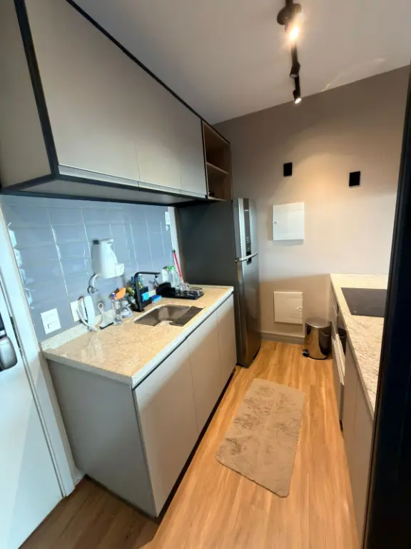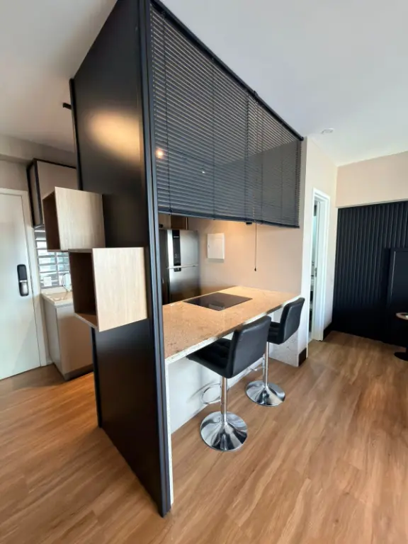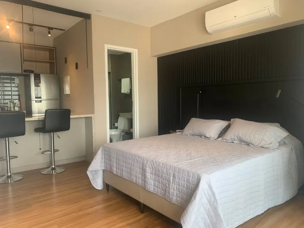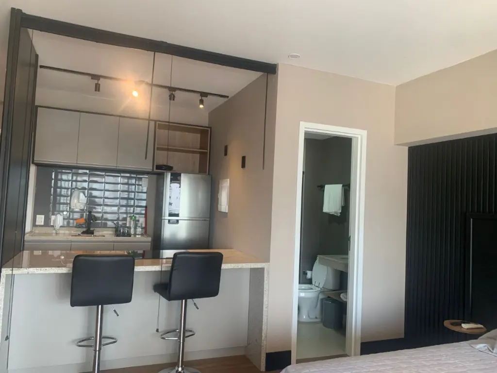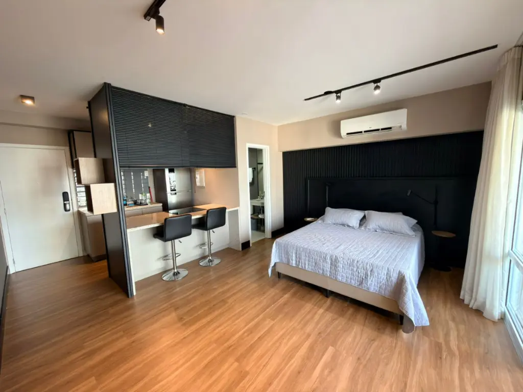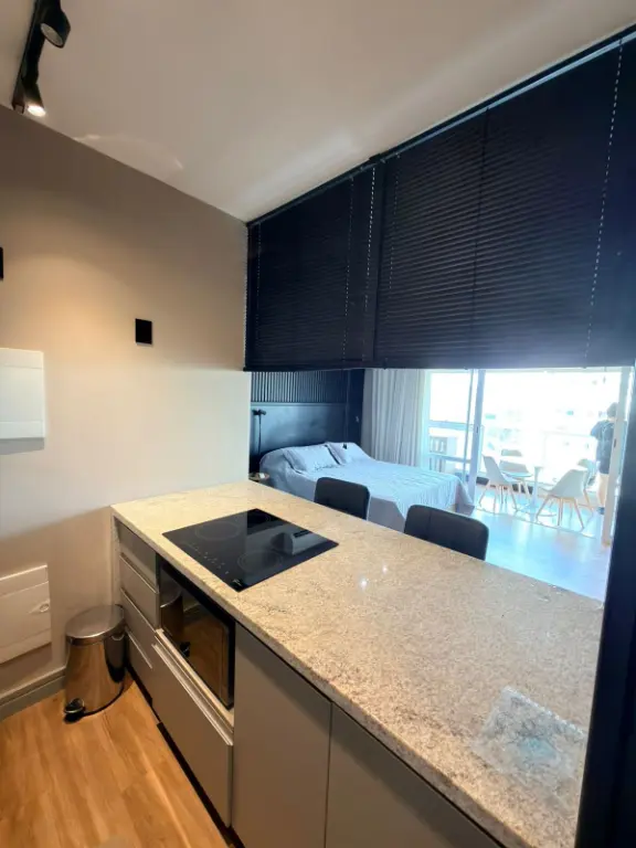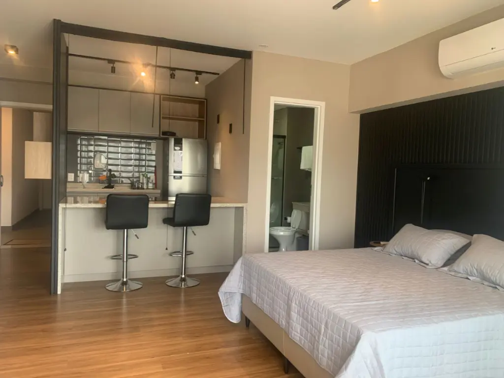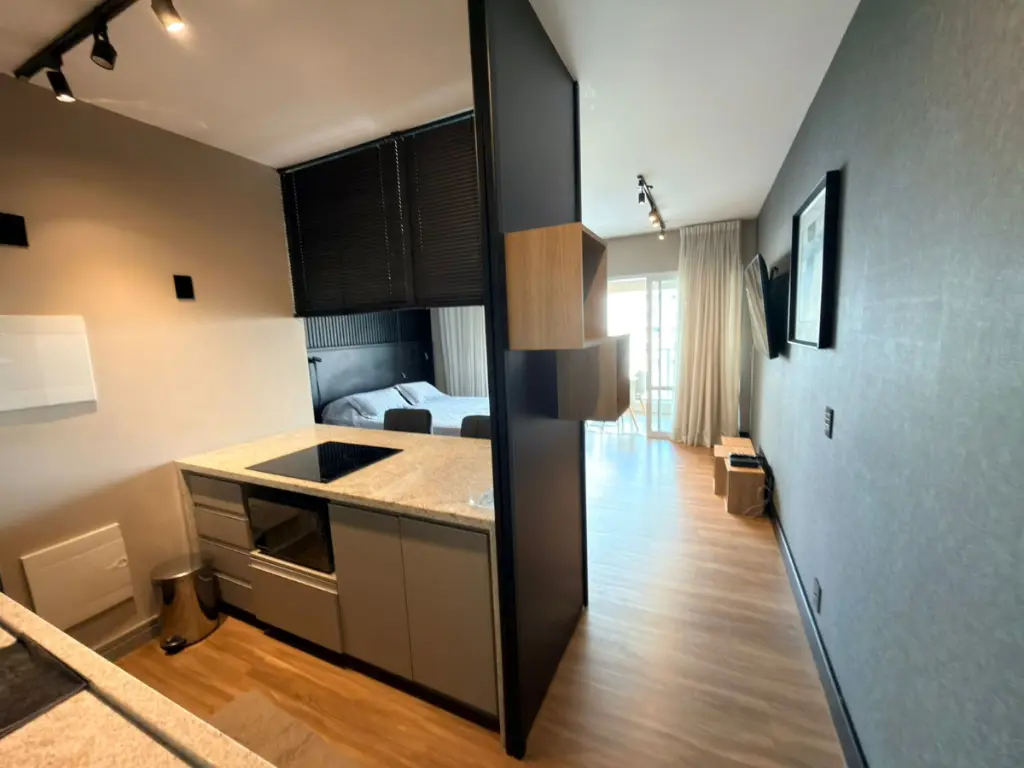 O ambiente integrado entre sala, dormitório e cozinha cria um espaço contemporâneo, versátil e acolhedor, ideal para quem busca um estilo de vida dinâmico sem abrir mão do conforto. A cozinha segue o conceito americano, conectada ao living, favorecendo a convivência e trazendo leveza ao layout. Cada detalhe foi pensado para oferecer praticidade e sofisticação no dia a dia.